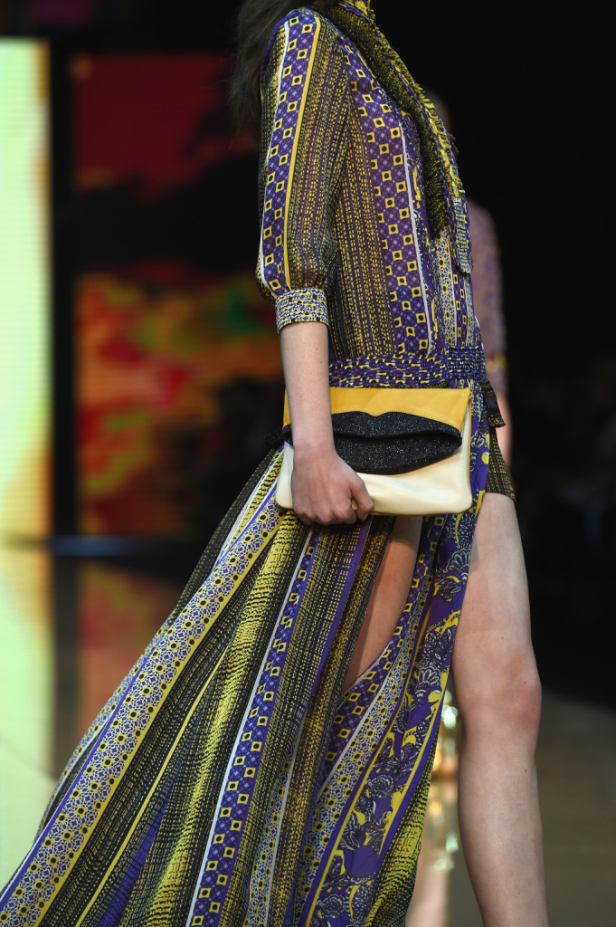 A regnare tra gli accessori per la ss 2015 Just Cavalli sono sandali con zeppa bassa – super glam nella versione metallo oro –, occhiali piccoli e tondi alla John Lennon e a forma di sole, foulard di seta abbinati a vestiti e pantaloni, clutches divertenti che ritraggono sensuali labbra femminili.