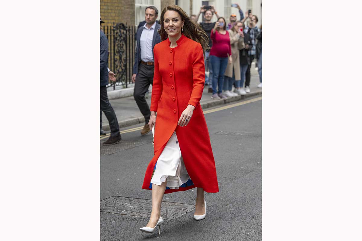 Kate Middleton da anni, ormai, rappresenta il suo Paese con stile. Nella sua ultima uscita pubblica prima dell’incoronazione di suo suocero, la Principessa del Galles ha sfoggiato un audace cappotto griffato Eponine London, con colletto alla coreana e grandi bottoni sul davanti, rosso con una fodera blu brillante. I colori della bandiera britannica, appunto. Non è la prima volta che lo indossa. Lo aveva già sfoggiato in altre due occasioni: per il lancio di un libro fotografico che ha pubblicato nel 2021, intitolato “Hold Still”, e durante una visita al Castello di Cardiff durante il Giubileo di Platino della regina Elisabetta II.