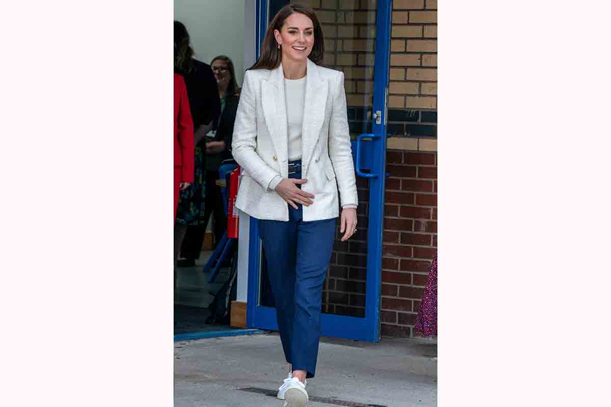 Kate Middleton ha rappresentato la famiglia reale britannica a un importante incontro presso il college di Derby. Con lei c’era Preet Chandi, ufficiale medico dell’esercito appena rientrata da una spedizione “in solitaria” dall’Antartide fino al Polo Sud. Per l’occasione, la principessa del Galles ha scelto uno stile casual: un blazer bianco come la neve, pantaloni a sigaretta blue navy e sneakers bianche.
