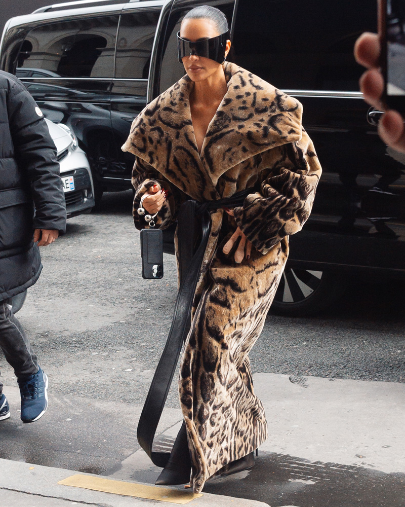 Maxi pelliccia couture maculata, décolletè nere a punta, capelli raccolti in una coda alta e tiratissima: Kim Kardashian a Parigi si fa notare. L’imprenditrice è in città per la fashion week, evento mondano che attira star da tutto il mondo. Lei, in questo caso, si sta solo spostando da un appuntamento a un altro ma il suo look è degno di un défilé. Il long coat è firmato Balenciaga, così come i voluminosi occhiali da sole. Sono i 24/7 che la maison parigina ha portato in passerella domenica 3 marzo e che sono giù un successo. Subito dopo lo show, i sunglasses sono stati messi in vendita, in tre varianti di colore, sul sito ufficiale del brand e sono letteralmente andati a ruba.