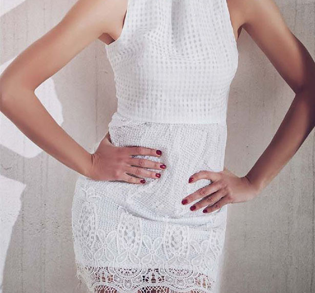 Di grande fascino è anche il mini dress Salice bianco e lungo fino al ginocchio in doppio tessuto ricamato a effetto crochet.