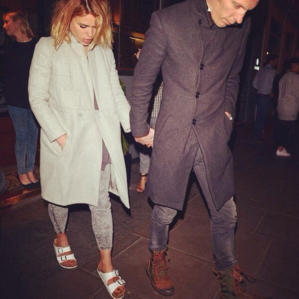 La bellissima attrice e cantante Billie Piper, famosa per aver intrepretato Belle/Hannah nella serie tv Secret diary of a call girl, sceglie la pianella a due fibbie bianca abbinata a un jeans chiaro skinny e una giacca lunga.
