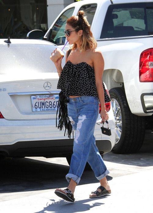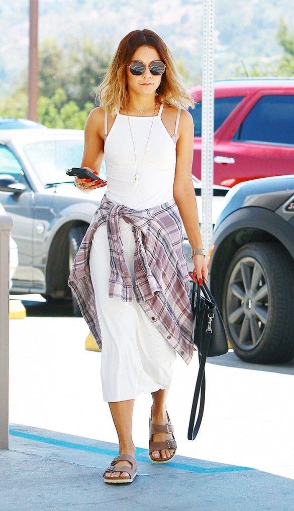 Vanessa Hudgens, attrice, cantante e ballerina statunitense, che ha raggiunto l’apice della notorietà grazie alla serie tv High School Musical, utilizza spesso le pianelle a due fibbie Birkenstock (in genere nere o color cuoio) e le abbina in modo differente in ogni suo outfit. Nella fotogallery possiamo notare come riesca con semplicità ad abbinarle sia a un paio di jeans classici alla caviglia e un top a pois che a una salopette sempre di jeans e una maglia a righe, per un look casual e pratico. Nei suoi outfit le pianelle sono anche abbinate a gonne o abiti abiti lunghi fino al ginocchio, rigorosamente in cotone, per un look estivo e fresco.