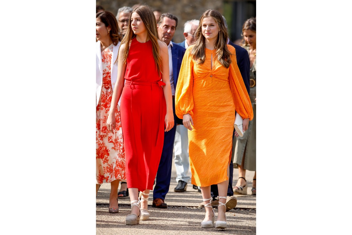 L’outfit scelto per l’occasione era informale ma le principesse si sono distinte per la loro aria regale. Erano molto eleganti ma non troppo impostate con un look a contrasto. Leonor ha optato per un vestito arancione firmato dal brand spagnolo Lady Pipa con un drappeggio al centro del seno e le maniche a palloncino. L’Infanta Sofia ha preferito un completo rosso di Sfera con top e pantaloni a culotte abbinati. Entrambe avevano i capelli lunghi sciolti e un make-up leggero, perfetto per due giovani ragazze.