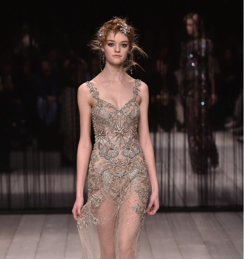 Abiti fluttuanti, leggeri e translucidi, caratterizzati da veli trasparenti, texture preziose, dettagli ricercati e ricami all over.