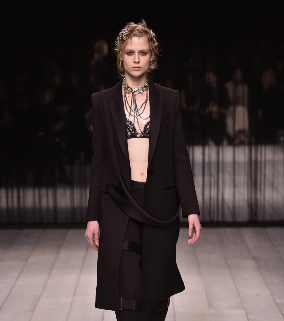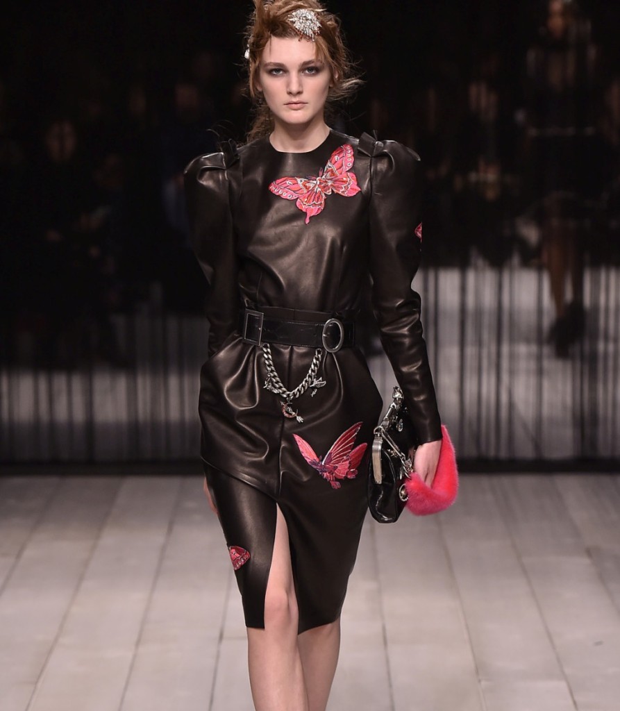 Ma la sfilata di Alexander McQueen non è solo questo, perché lo spettacolo è stato caratterizzato anche da una nota dark, cupa e misteriosa: giacche over in total black con decori, abiti scuri con dettagli fur, pantaloni con fibbie indossati insieme a lunghi tuxedo dal taglio androgino, mini-dress in pelle nera con cinturino a delineare il punto vita e decorazioni d’impatto in contrasto di colore.