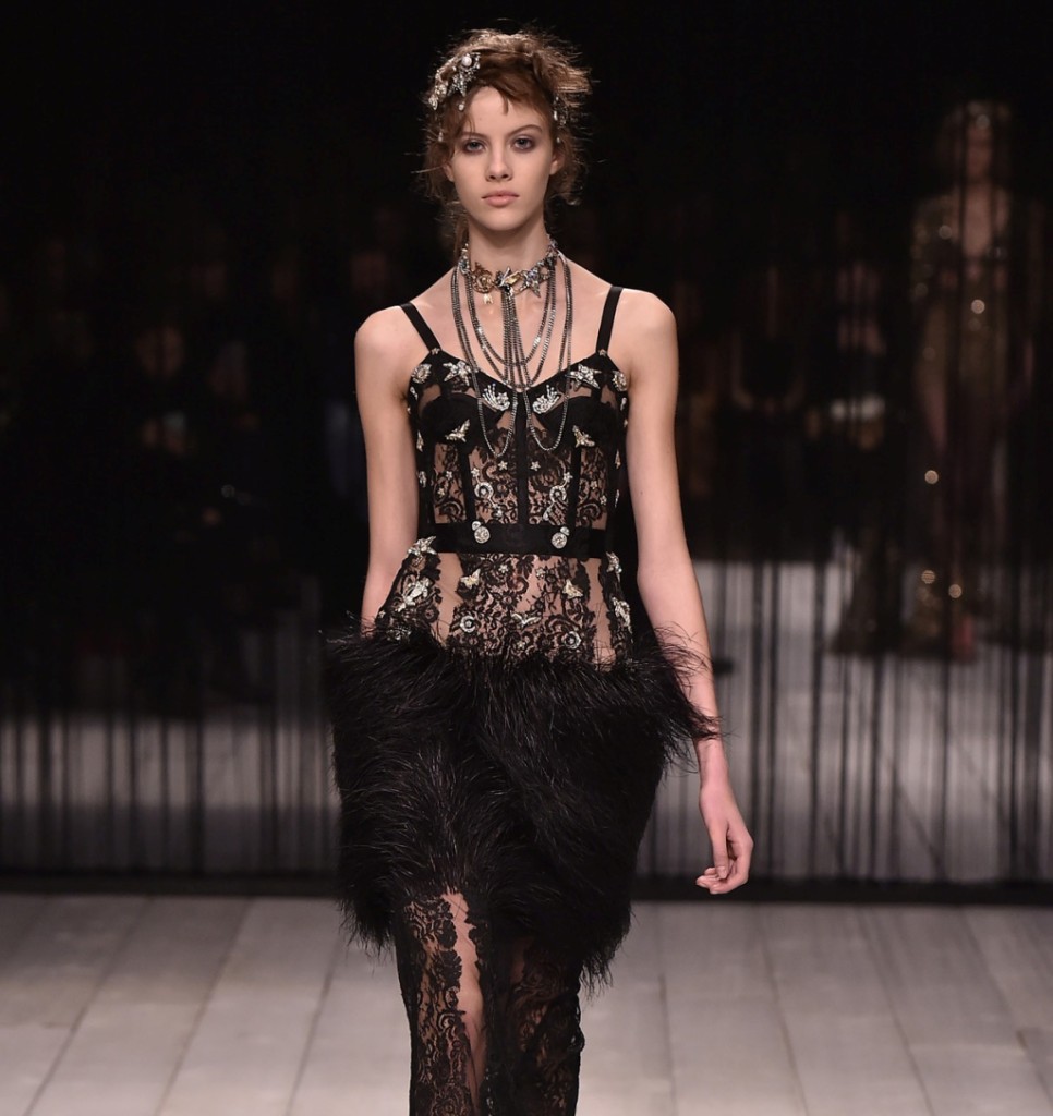 Sarah Burton veste l’immagine di una donna sensuale, affascinante, misteriosa e suadente che sembra essere uscita da un fantastico boudoir, per un vero e proprio inno alla femminilità.