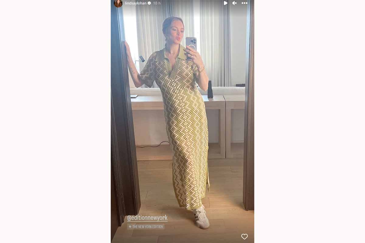 Lindsay Lohan è al settimo cielo. La star di “Mean Girls”, che aspetta il suo primo bambino insieme al marito finanziere Bader Shammas, ha mostrato per la prima volta il suo pancino su Instagram. Per farlo ha indossato un lungo abito fasciante in maglia e un paio di sneakers.