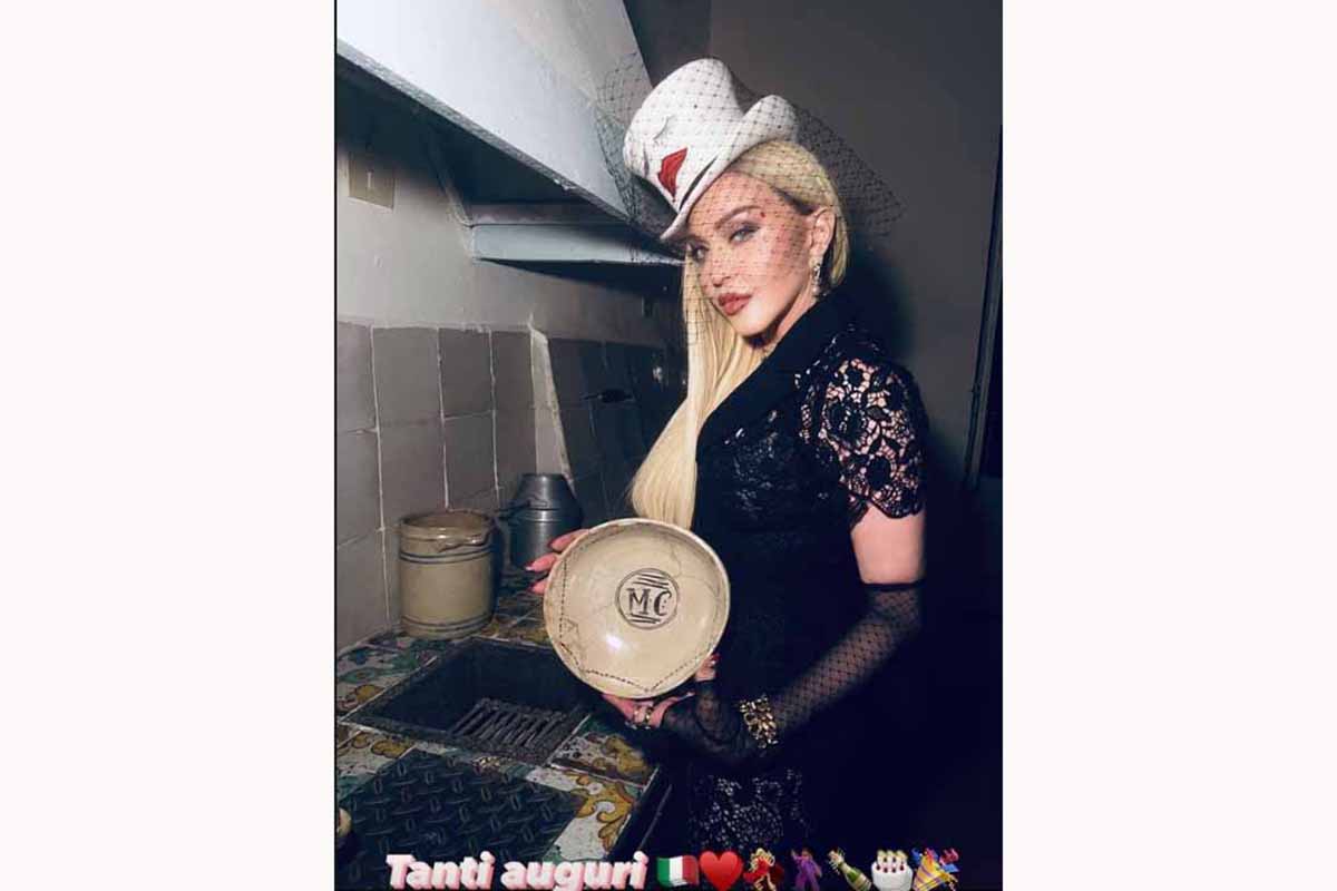 Madonna ha dato il via alla giornata di festa facendosi fotografare con le sue gemelle, Estere e Stella, con abiti firmati Dolce&Gabbana in omaggio alla Sicilia. Quindi si è cambiata e ha accolto i selezionatissimi ospiti che accorrevano alla sua festa con un look decisamente “surrealista”: un lungo abito in pizzo nero e un cilindro bianco con stampata una bocca rossa.