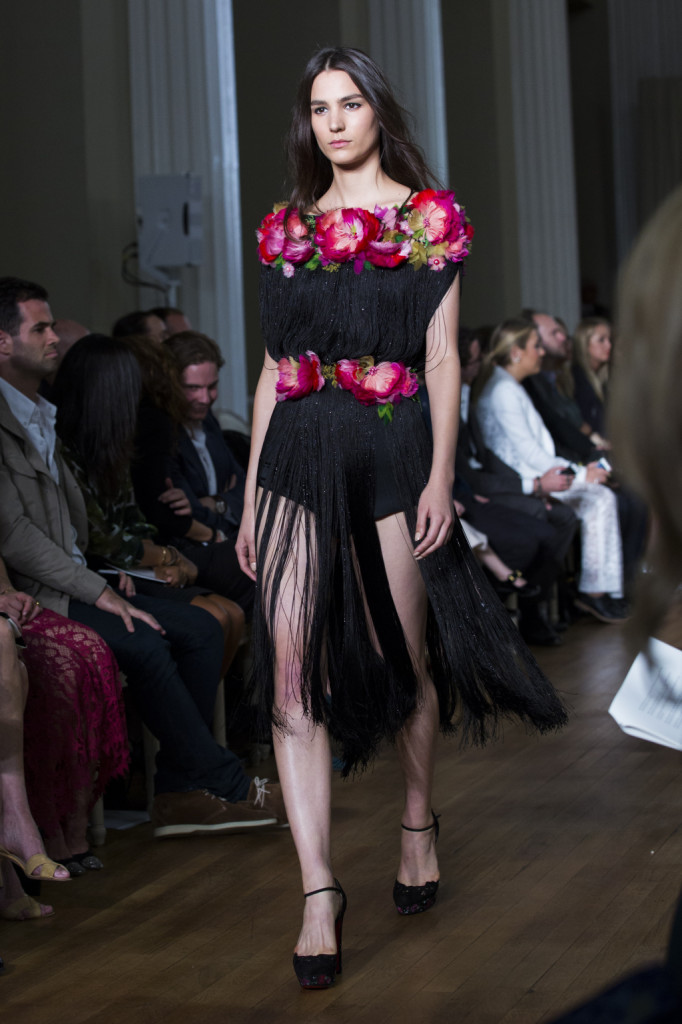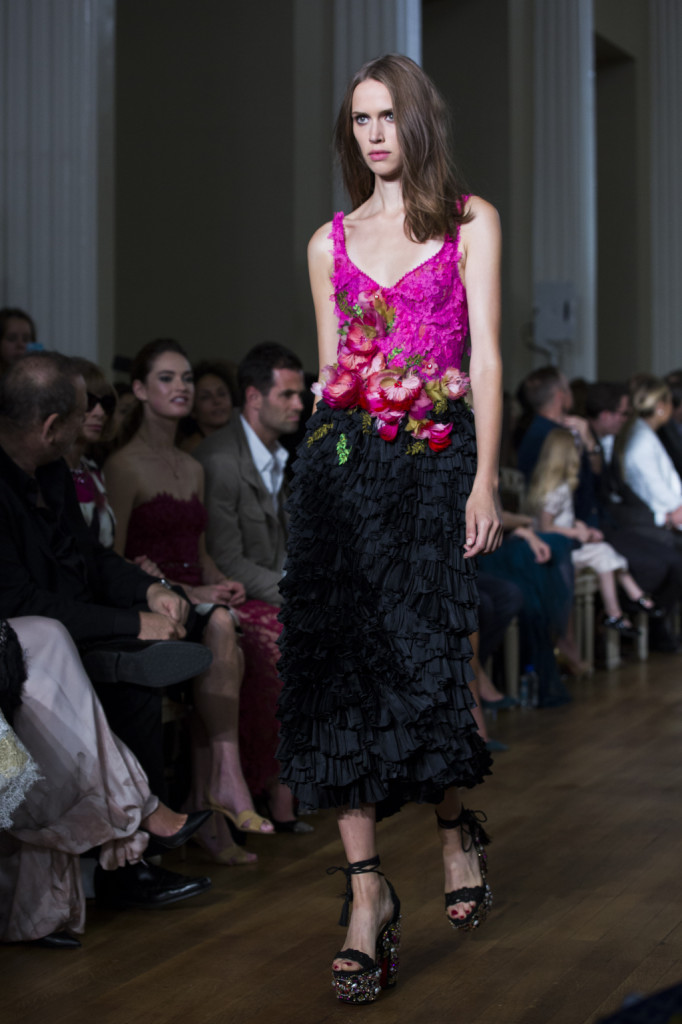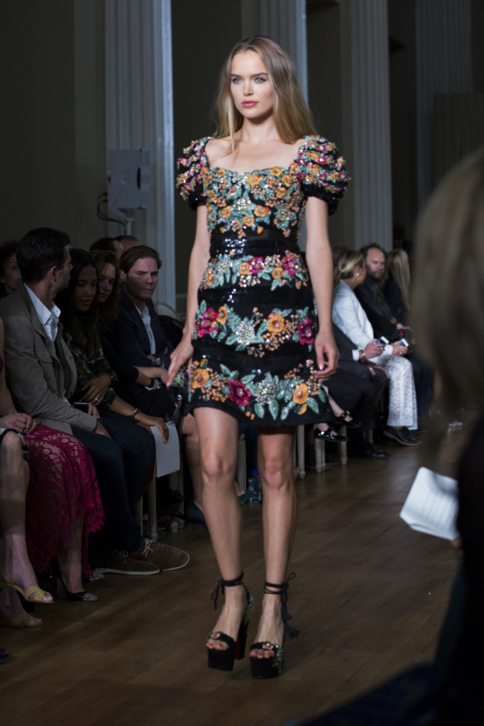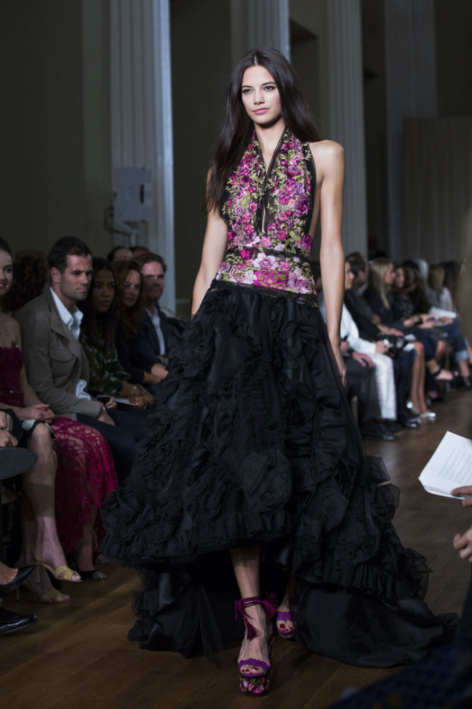 Tessuti leggeri e leggerissimi per tubini e vestiti corti dalle linee più morbide, con un vero tripudio, tra una striscia e l’altra, di fiori tridimensionali. Ricamati o vaporosi come nuvole di chiffon, a balze o tutto un pizzo: adatti per un festival di musica all’aperto e dichiaratamente animati da uno spirito gipsy moderno, gli abiti Marchesa primavera-estate 2015 sembrano provenire direttamente da una qualche fiaba che narri di principesse e fate. A cui, in alcuni outfit – e in abiti tanto corti e cortissimi (e pure con frange), quanto lunghi, il black che accompagna e contrasta i colori floreali dona un tocco perfino boho-rock.