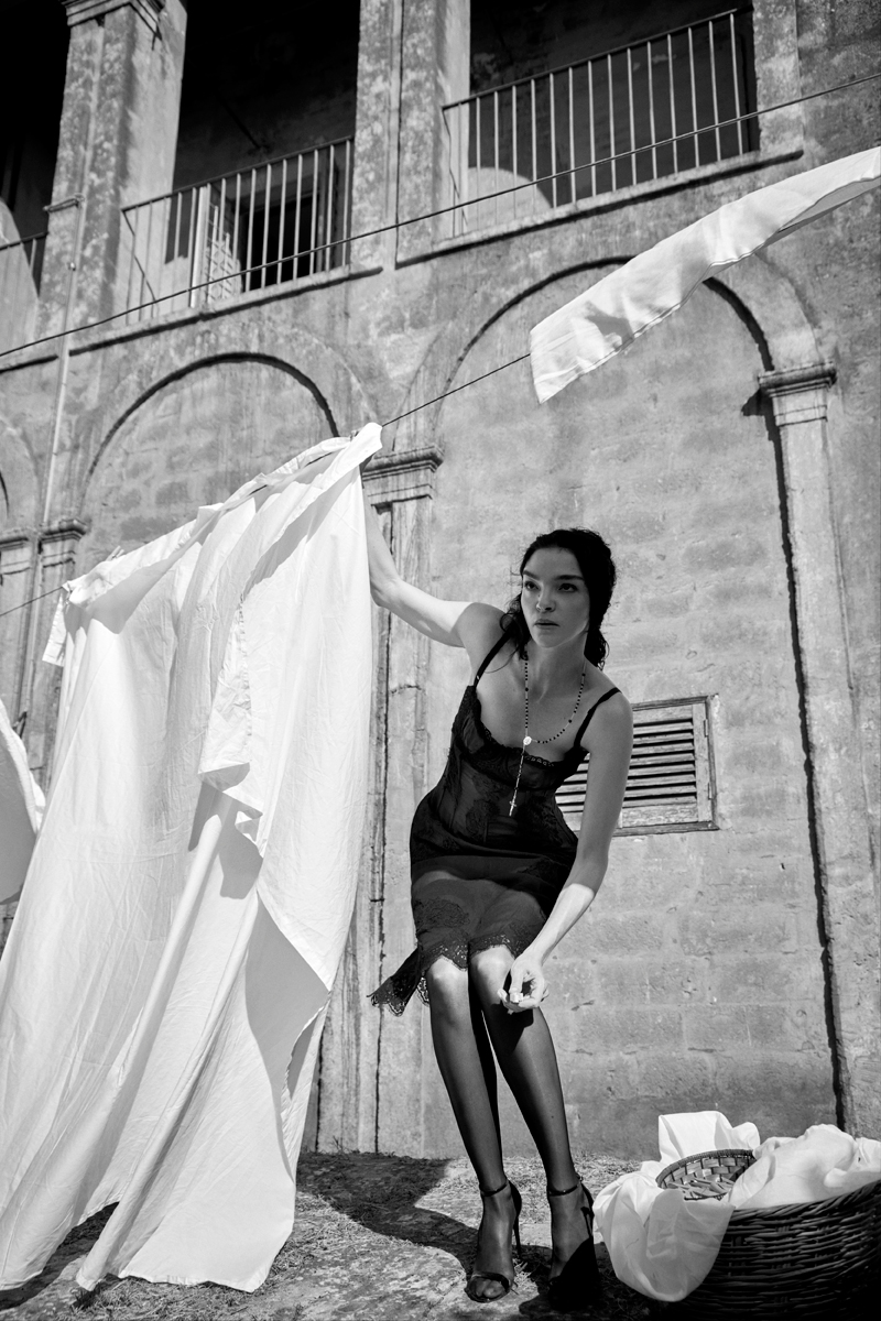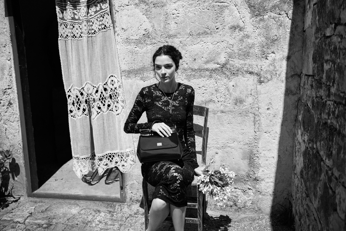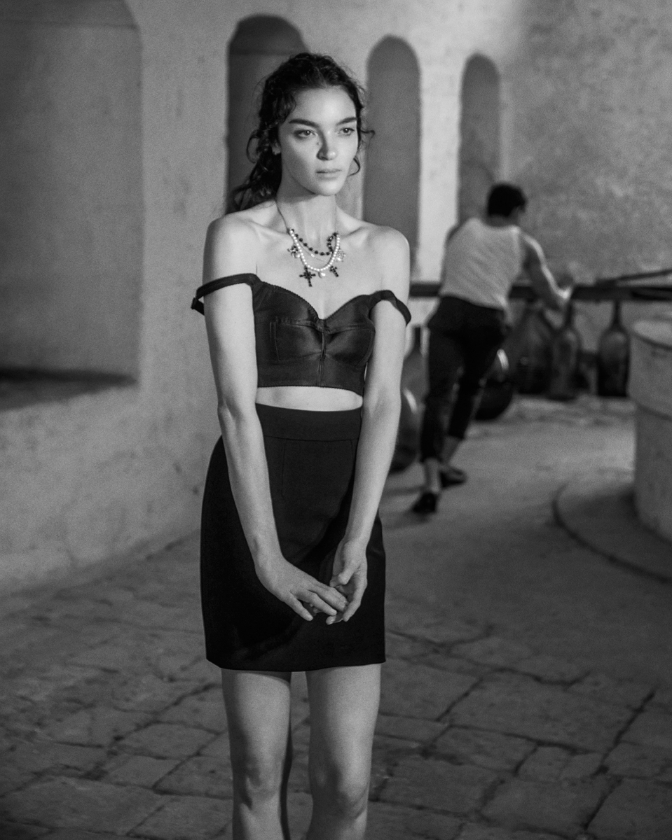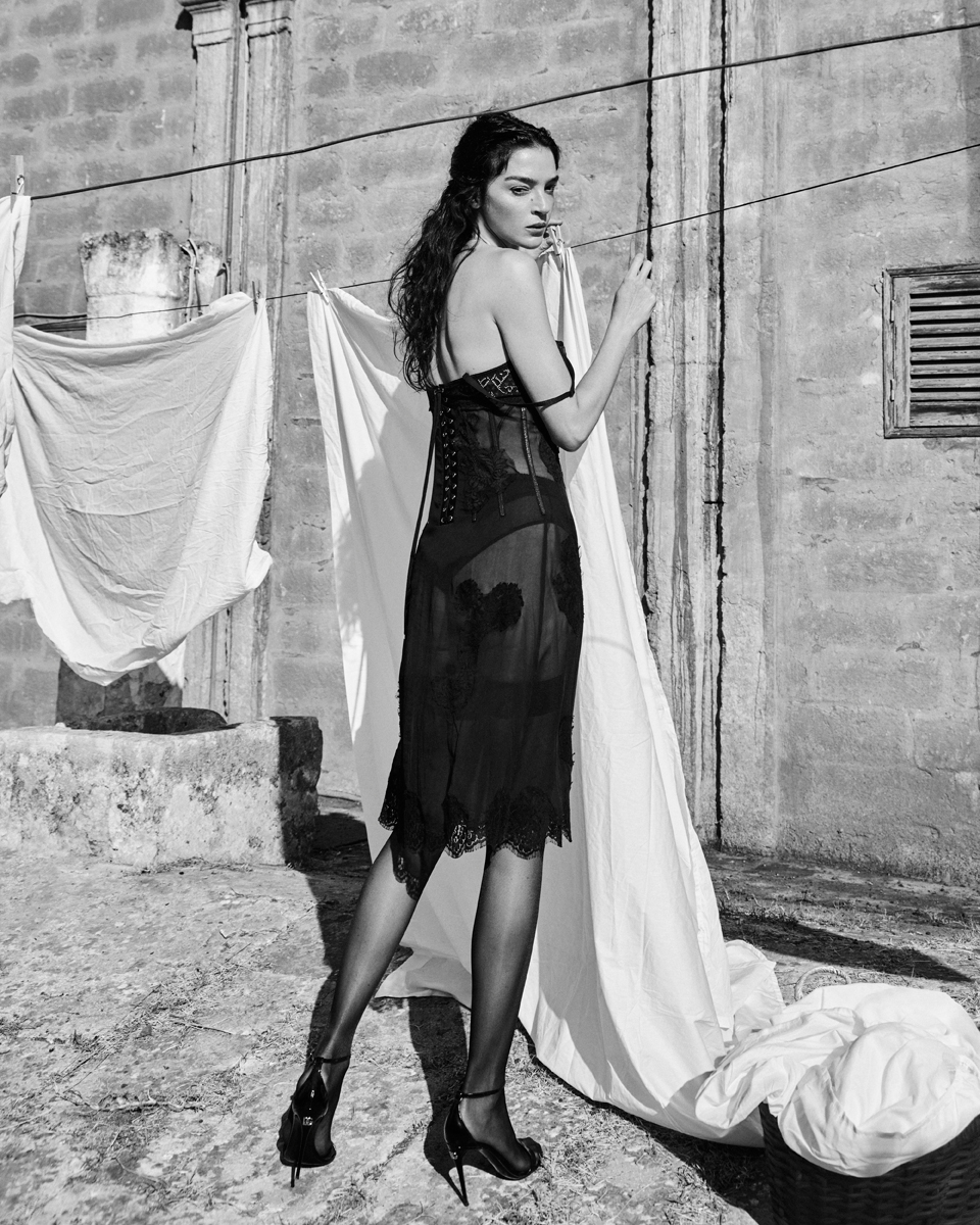 La top italiana è stata immortalata in una masseria settecentesca vicino a Monopoli, tra elementi rustici, mandorli, ceste di vimini e lenzuola stese al sole. Un’atmosfera che evoca la tradizione e il retrò, così cari all’estetica della maison. La supermodella alterna pose maliziose a sorrisi spontanei, con il corpo avvolto dagli abiti, tutti del classico “nero Sicilia”.