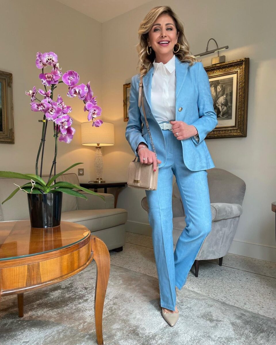 Da tempo, ormai, Marina Di Guardo si diverte a pubblicare sui social le sue foto con gli abiti che più la fanno sognare. Come il tailleur Pennyblack con giacca e gonna in stuoia di cotone stretch stampati a motivi floreali nei toni del blu, ispirati alle classiche maioliche di Delft. Le è bastato indossarlo per raccogliere un mare di like.