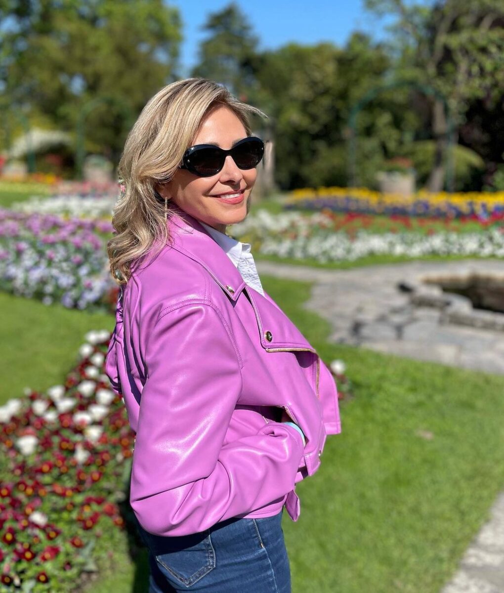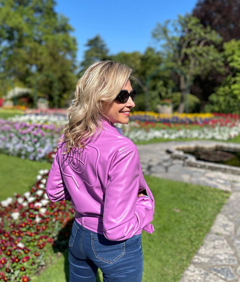 Capelli biondi leggermente ondulati, jeans a zampa, camicetta bianca e sopra uno chiccosissimo chiodo lilla. A passeggio tra i fiori e le piante secolari del Parco Pallavicino di Stresa, sul Lago Maggiore, Marina Di Guardo da lontano sembrava sua figlia Chiara Ferragni. In realtà, le ha solo “rubato” il giubbotto.