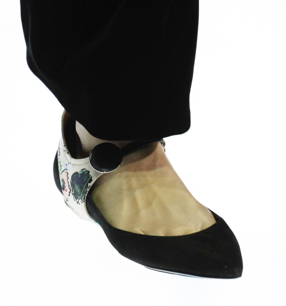 La donna firmata Giorgio Armani sfoggia delicate flat shoes in velluto ed eleganti handbag in pelle nera, pochette con dettagli shining e mini clutch con decori floreali.