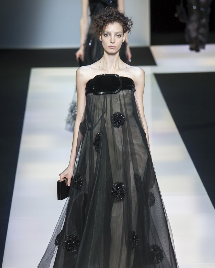 Il protagonista indiscusso dell’intera sfilata, definita con il nome di “Black Velvet”, è il velluto nero, molto amato dallo stilista perché dona luce e movimento a tutta la silhouette.