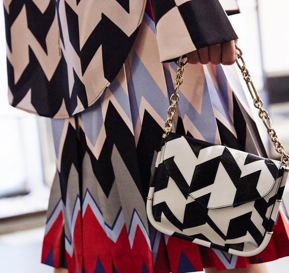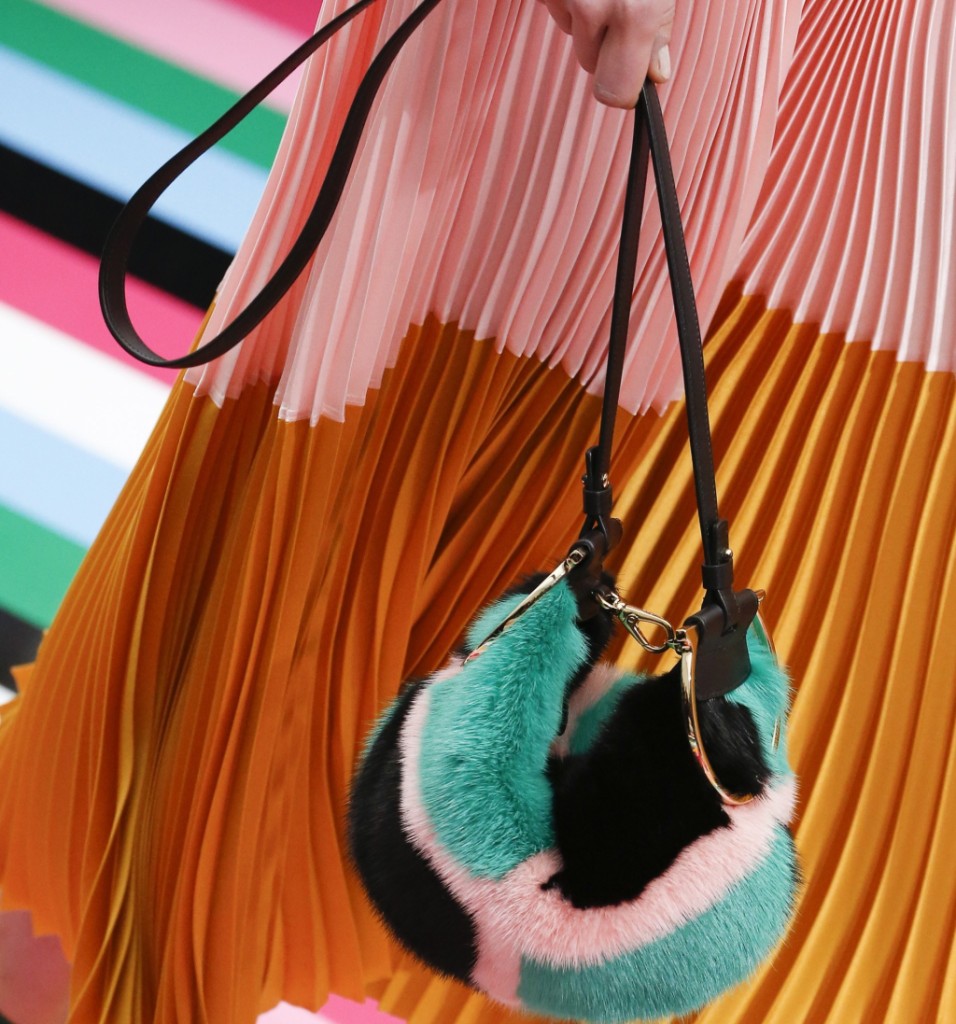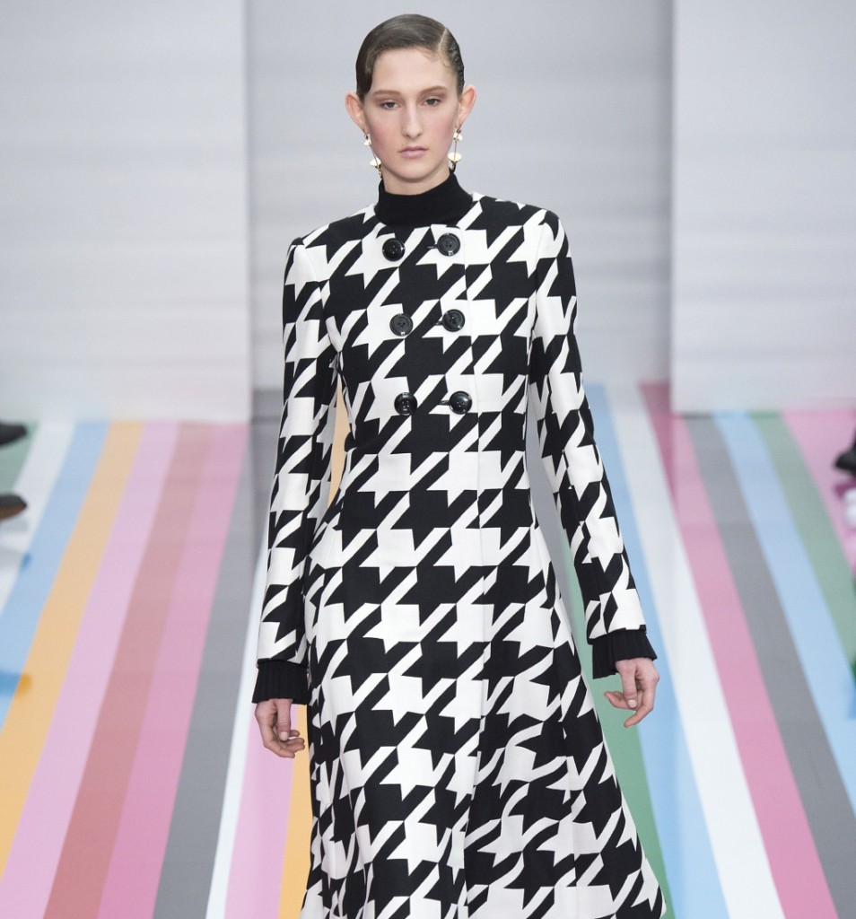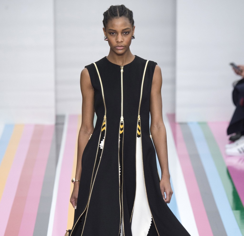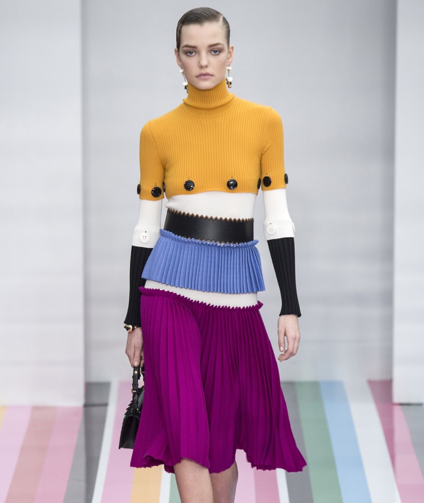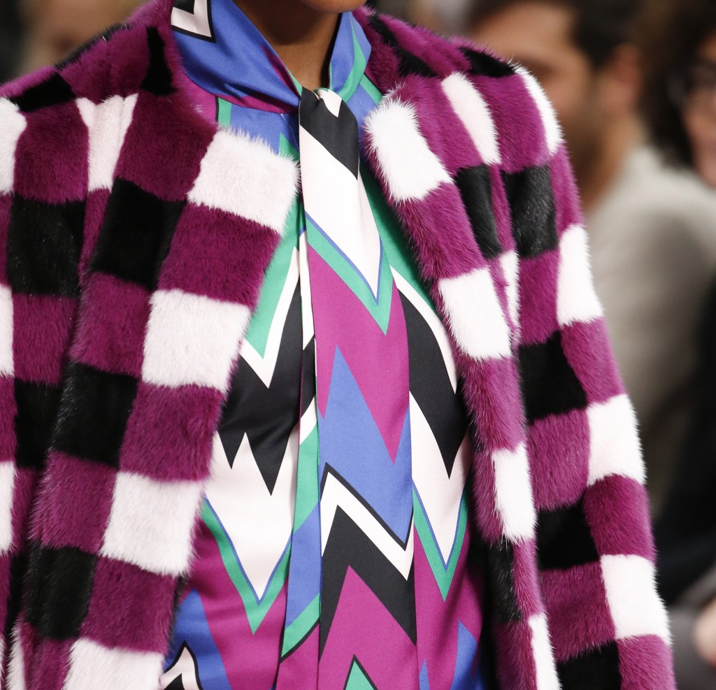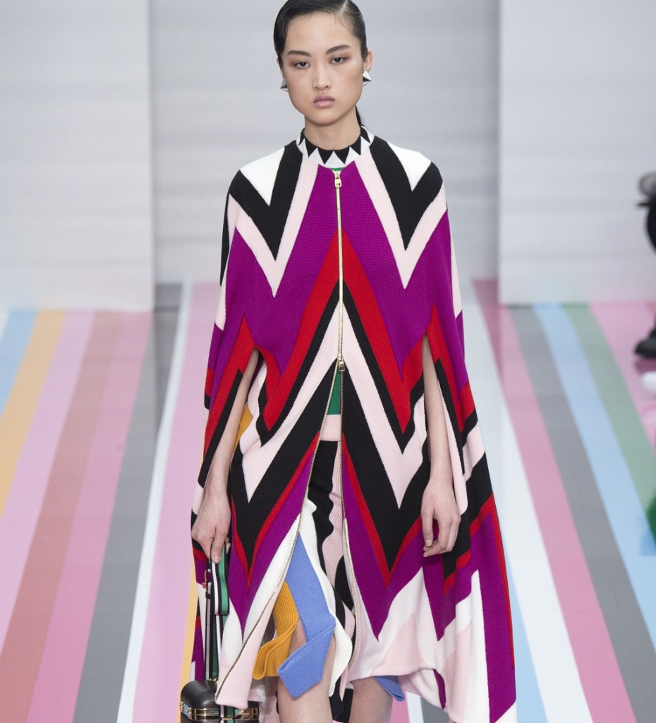 La palette cromatica è incisiva e gli accostamenti di colore audaci e netti, fantasie optical in black and white, zig-zag su pellicce e mini dress e color block su eleganti abiti con gonne a balze.