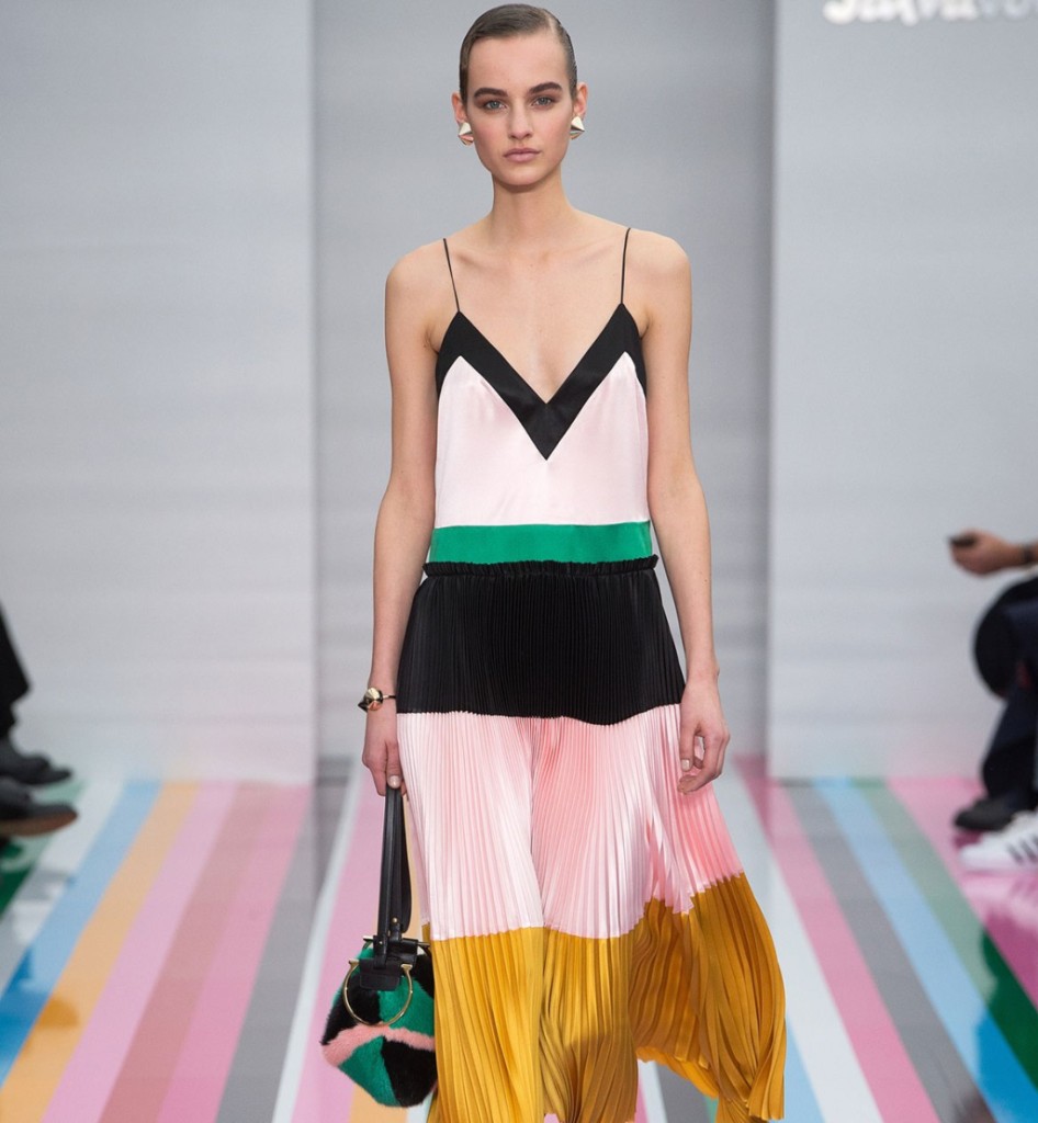 Una collezione che celebra la bella stagione e che ricorda i colori della primavera: verde, giallo, viola, celeste, bianco e rosso corallo dominano su abiti, mantelle, lunghi coat, long dress, gonne plissé, pellicce, borse e delicate bluse in seta, per una collezione dinamica, super femminile e decisamente moderna.