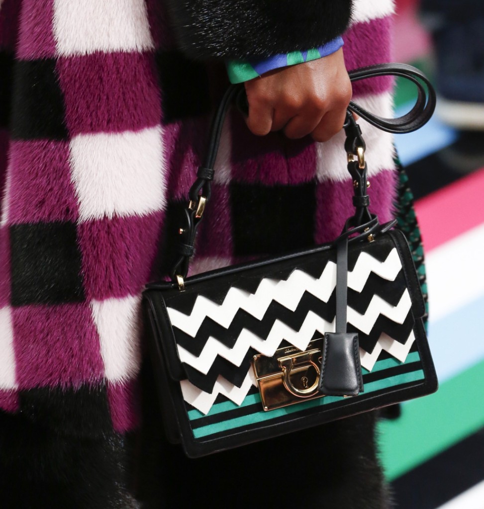 Per gli accessori, la donna Salvatore Ferragamo sfoggia mini bag di pelliccia colorata, deliziose handbag con motivo zig-zag o a righe multicolor, mentre per le scarpe via libera a sandali flat in velluto e con applicazioni fur, stivaletti optical e T-Strap shoes in pelle.