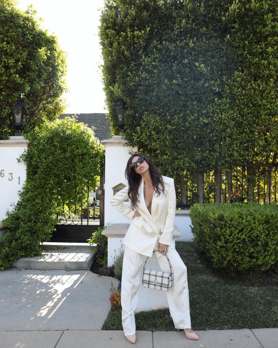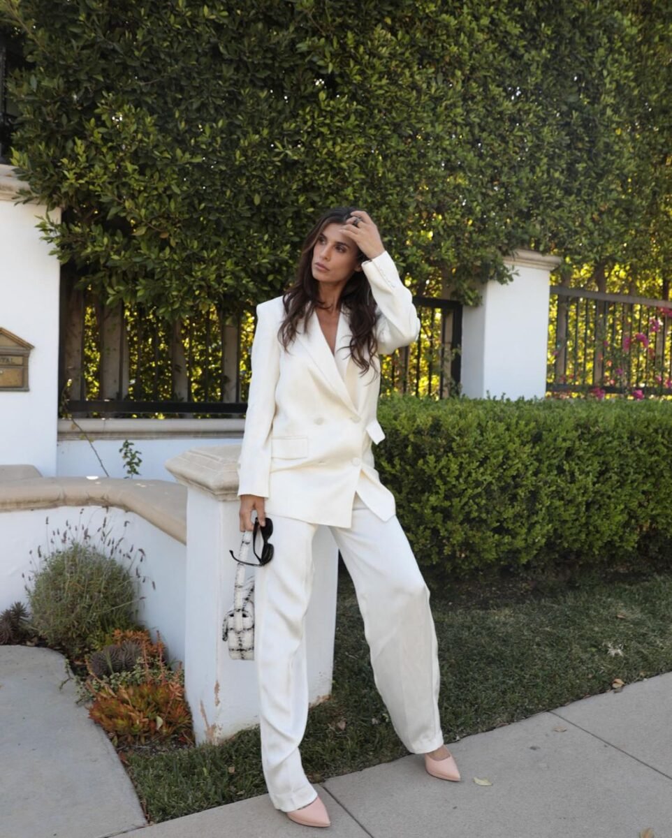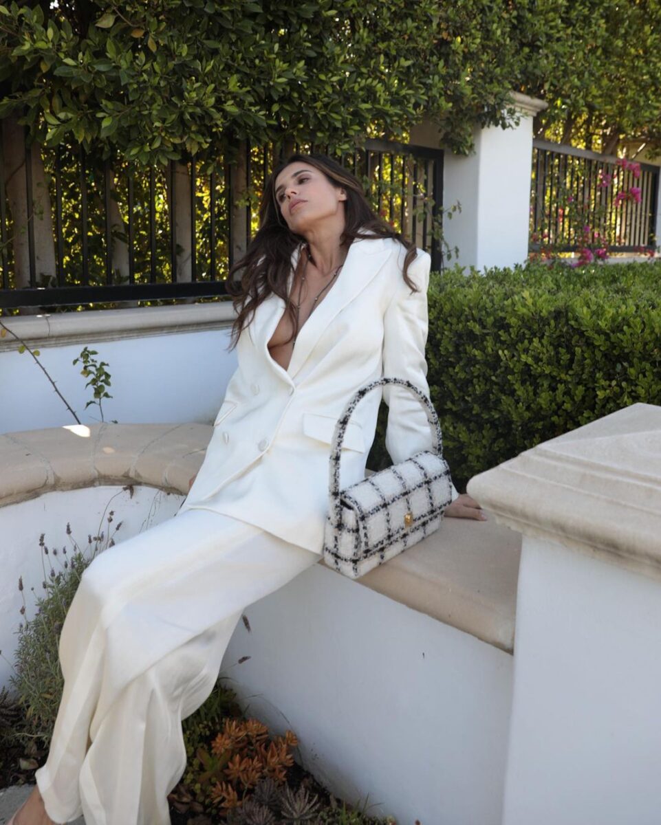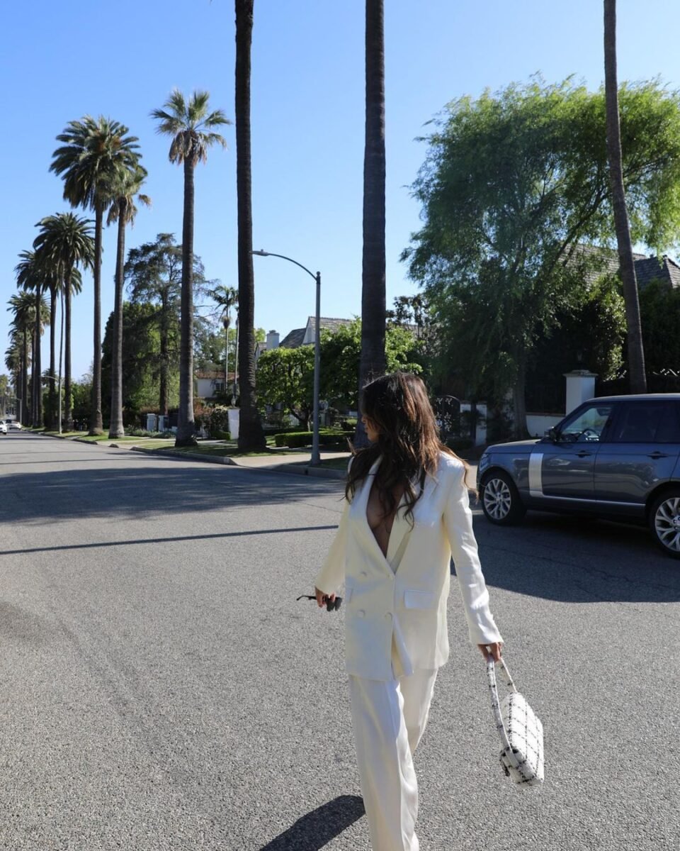 A Los Angeles, dove vive ormai da qualche anno con il marito e la figlia in una enorme villa a due piani con giardino, l’ex velina di “Striscia la notizia” si è fatta fotografare con un outfit total white. Un tailleur con pantaloni e blazer oversize, senza nulla sotto. La showgirl ha lasciato nuda la scollatura a V, impreziosendola con una collana.