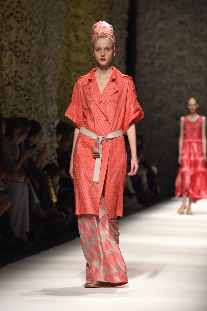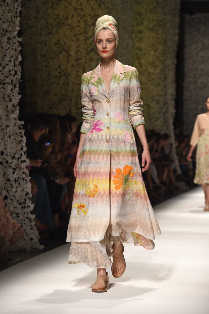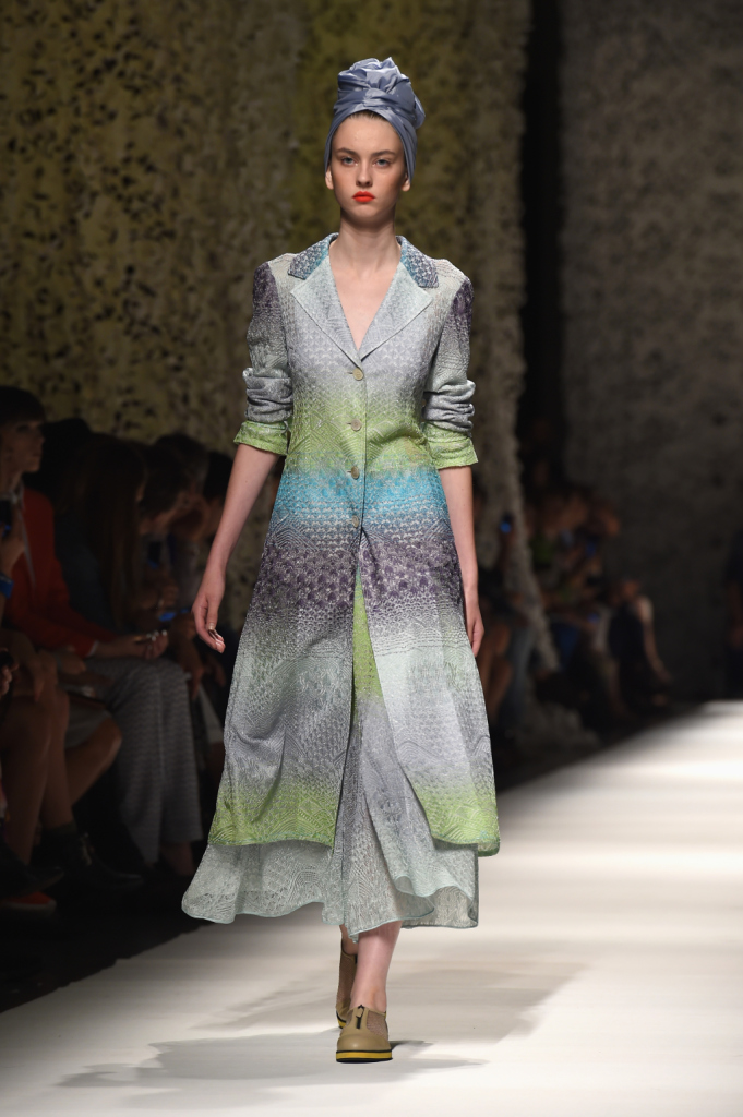 La lavorazione magistrale di tessuti e maglieria è una parte integrante della storia di Missoni che si fa visibile in tutte le collezioni e le mise della griffe. Per la collezione primavera estate 2015, Missoni sceglie le tinte pastello, come il beige e le stampe floreali declinate su cappottini, vestiti, tuniche e camicie oversize, le tonalità cipria sui trench o, ancora, le nuance chiare dei cappottini lunghi fino ai piedi in rigoroso stile ottocentesco, le sfumature pastello dell’écru, del rosa e del giallo che si mescolano ai toni brillanti del verde, del turchese per, poi, approdare al mauve, viola e rubino. Gli abiti sono in tutte le declinazioni: tinta unita, multicolor, degradè con strisce orizzontali. Si legge un po’ d’Oriente nella sfilata Missoni alla Milano fashion Week 2014.
