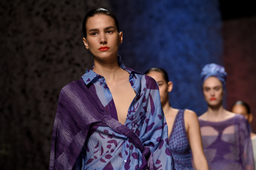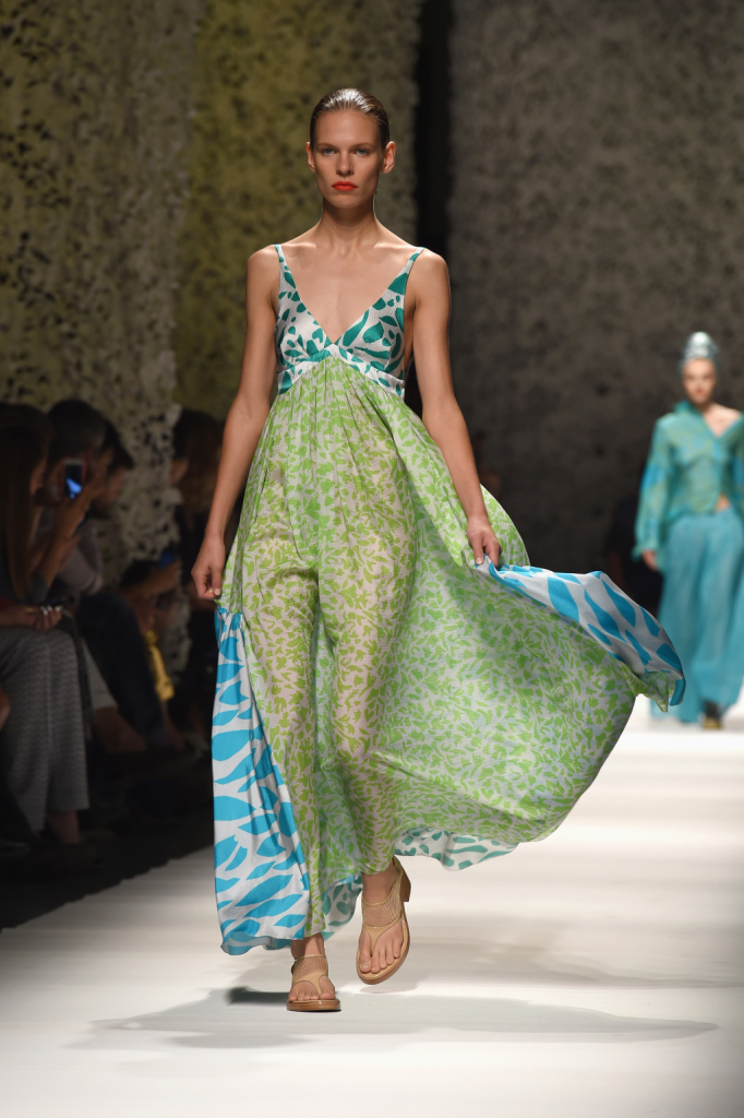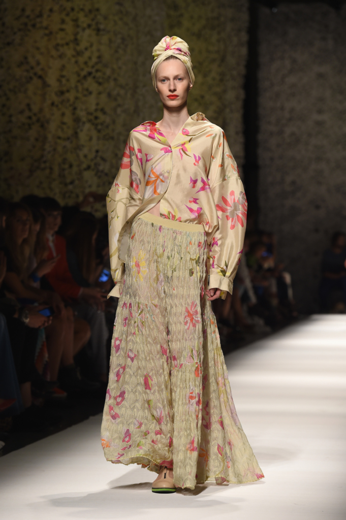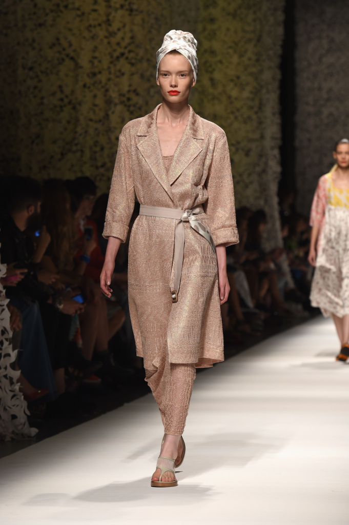 Con leggiadria incede la donna Missoni, vestita di abiti leggeri, quasi evanescenti, da quelli con balze asimmetriche ai long dress fino alla caviglia, dai pantaloni gonna ai trench scivolati fin sopra il ginocchio, dalle camicie over e a vita alta alle gonne a ruota e ariose. Tutto è reso quasi impalpabile dall’oculata scelta dei tessuti. E la morbidezza e il buon grado di sinuosità fa apparire le indossatrici come ninfe dei boschi.