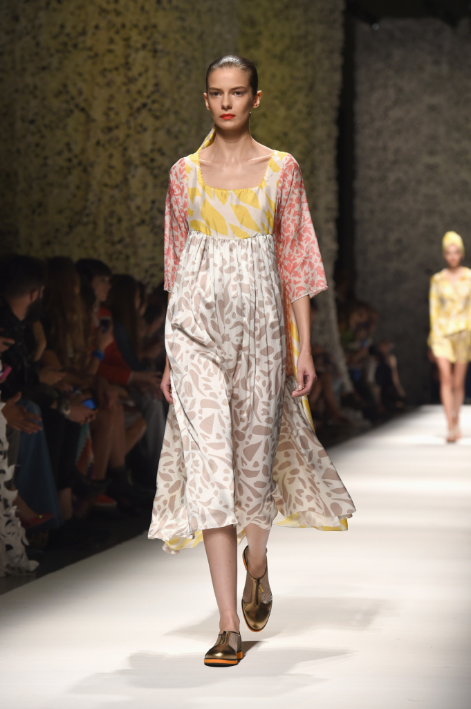 La primavera invade l’occhio della platea, opportunatamente aperto per non perdere alcun dettaglio, una gioia visiva dall’abito lungo a quello in chiffon, dagli inserti patchwork ai modelli in raso bianco con pennellate stile acquerello.