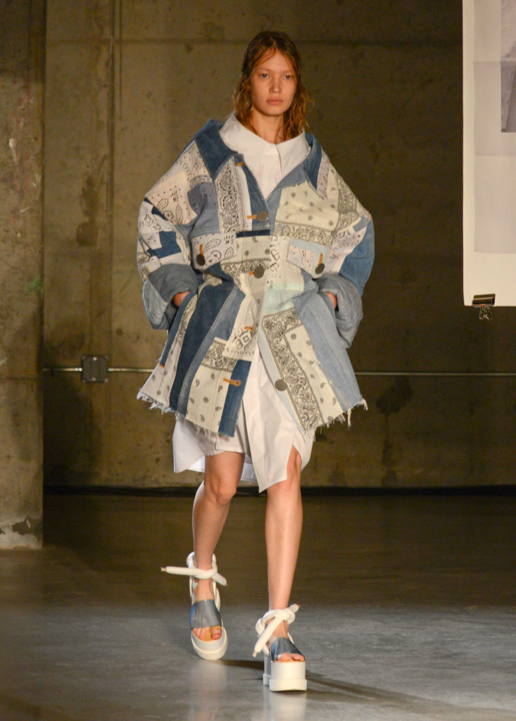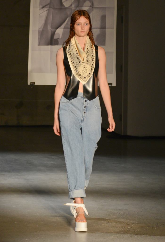 Anni ’70, con la passione per il West e la pelle, i gilet, i jeans larghi, le frange, anche lunghissime, su pantaloni e soprattutto borse, le stampe bandana che compaiono in patchwork sul denim, che diventano strettissimi top e che dominano in una giacca over che è uno dei capi più interessanti della collezione MM6 Maison Martin Margiela primavera-estate 2015. E, a fianco – ma non insieme – un profluvio di quasi-pigiami e vestaglie dalle linee morbide e perfino oversize, più orientaleggiante che orientale, e in senso piuttosto lato: un po’ per il satin, un po’ per le stampe floreali black&white. La palette? Tutto sommato ridotta: prevale il denim chiaro, cui si sommano la pelle e, appunto, il bianco e nero. Da aggiungere, solo qualche rosso, verde e azzurro.