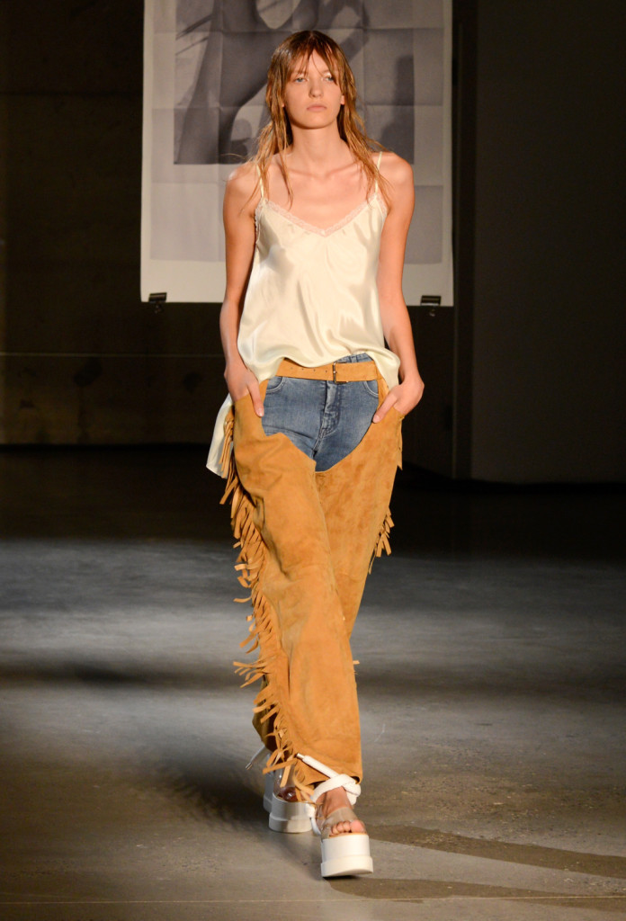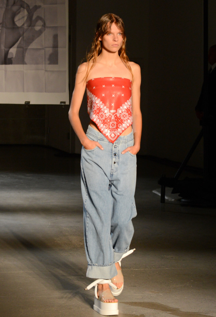 Collezione MM6 Maison Martin Margiela s/s 2015, ovvero: il relax della cowgirl. Gli ingredienti? Un denim reinterpretato, sovrapantaloni, frange e stampe da bandana. Da accompagnare con un underwear che diventa outerwear, sete e satin, pizzi e cinture obi in stile orientale. Da condire con un continuo gioco tra over e mini e da accompagnare, rigorosamente, con un bel paio di zeppe.