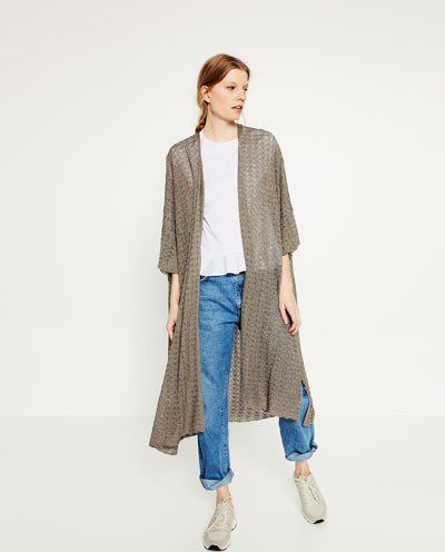Lungo e leggero, il cappotto vestaglia è l’”ibrido” che ha conquistato la moda primavera-estate 2016. Ideale per ripararvi in una giornata fresca o quando scende la sera, potete indossarlo aperto, per un mood casual, o con una cintura che segna il punto vita, per uno stile elegante. Se volete farvi un’idea, date un’occhiata al cappotto vestaglia traforato (39,95 euro) e a quello con stampa jacquard (59,95 euro) di Zara e al modello reversibile in raso e crêpe di Etro (2.185 euro).