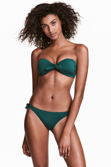 Anche da H&M non mancano i bikini a tinta unita (vedi bikini verde smeraldo a fascia in gallery). Anche quest’anno uno dei pezzi forti è certamente il trikini e H&M ne propone due molto carini: uno bordeaux aperto sui fianchi e con volant sul davanti, e uno total black, anch’esso aperto sui fianchi, in un tessuto che ricorda tantissimo il pizzo. Nella collezione estiva sono presenti anche i costumi da bagno dove lo slip è abbinato al top o brassiere, come vuole la tendenza dell’ultimo periodo: un modello certamente un po’ più coprente, ma al tempo stesso particolare.