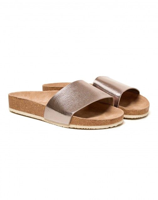 Benetton pensa anche ai nostri piedi e propone nella sua collezione un paio di sandali bassi con fascia in simil pelle metallizzata beige. Mentre H&M ne propone di simili, per uscite giornaliere o per la spiaggia: sandali slip-on in finta pelle con fodera e soletta in finto camoscio, disponibili nelle tonalità nero e argento.