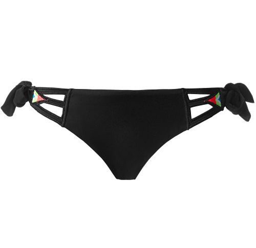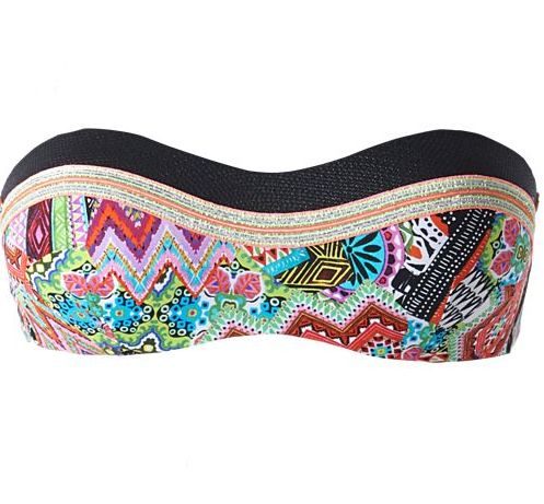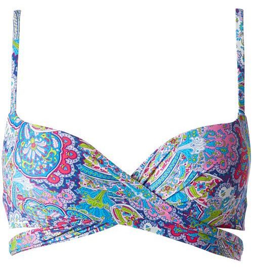 Modelli super colorati e caratterizzati da dettagli e fantasie che richiamano la stagione estiva come il bikini con fascia imbottita, decorazioni multicolor e bordino metallizzato oppure il modello Ninfea coloratissimo e caratterizzato da slip con laccetti e triangolo imbottito con applicazioni di paillettes, e ancora il modello push up con stampa cashmere e intrecciato sulla schiena.