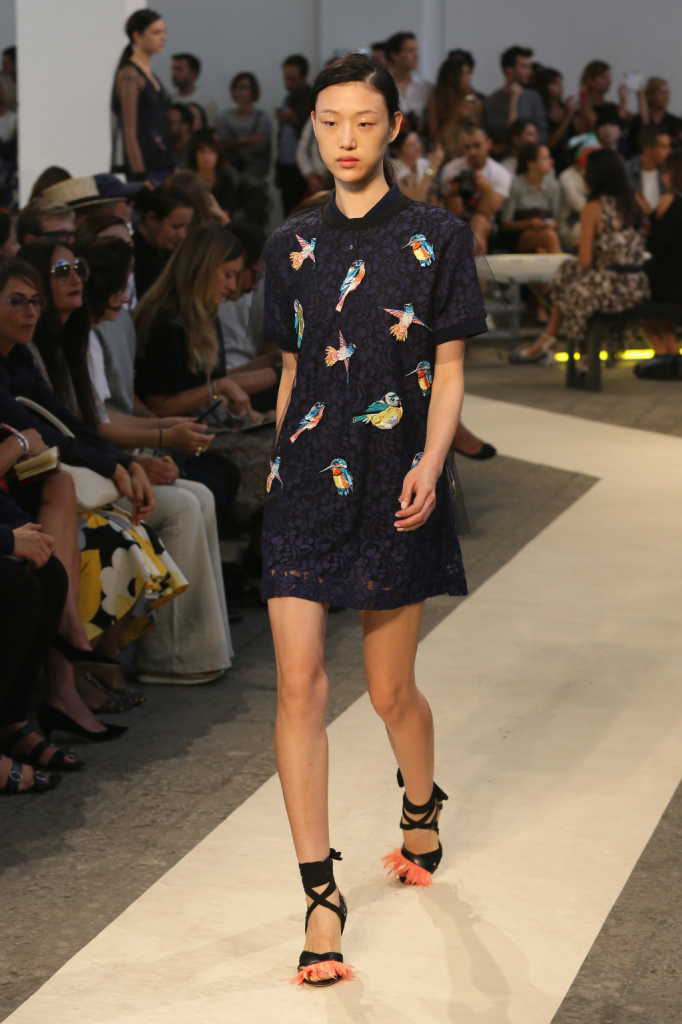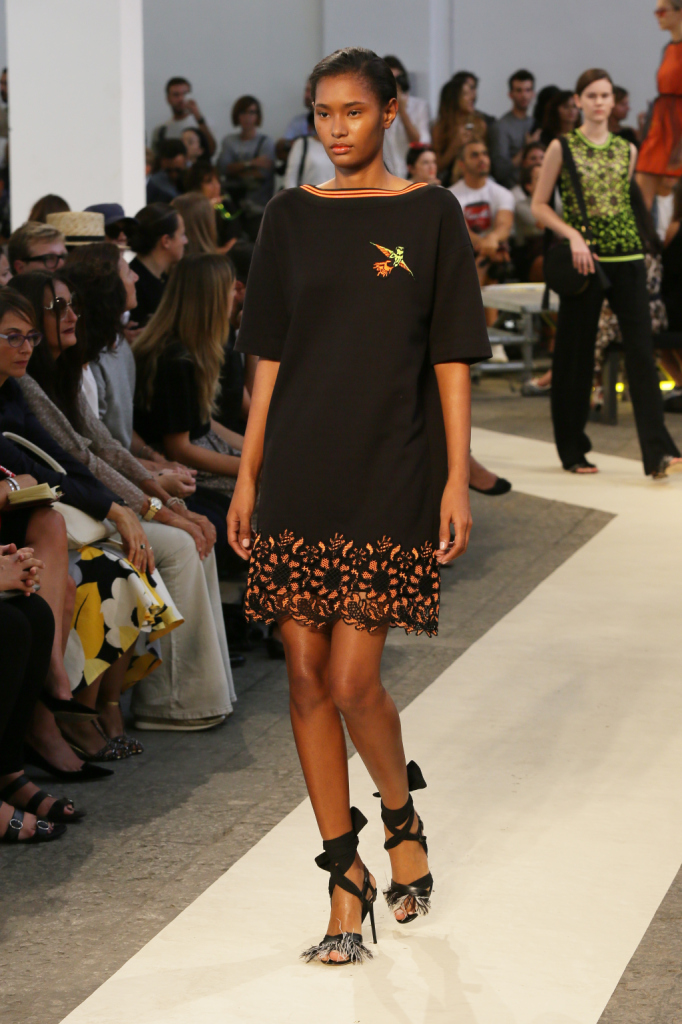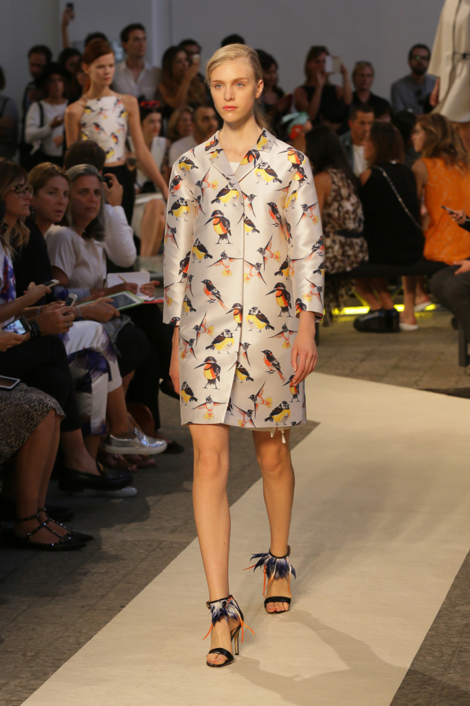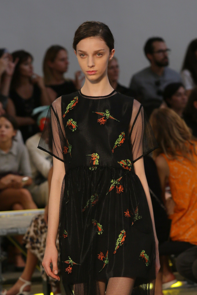 Se i passerotti dettano perfino gran parte della palette della ss 2015 MSGM – nero, bianco, blu, arancio, giallo accanto ai lettering multicolor –, la collezione è un tripudio di pennuti di ogni genere. Lettere capitali e picchi rock style, colibrì & c. che si fanno stampe e pure preziosi ricami per mini abiti e tubini corti e asimmetrici, per gonne e top, per giacche-impermeabili trasparenti. Capi semplici e puliti, dalle linee nette e dal mood assai urban, che le fantasie e gli inserti arricchiscono e addolciscono.