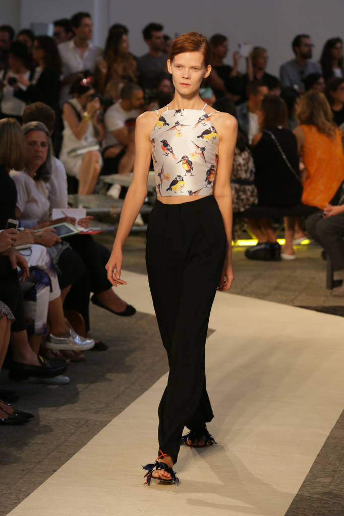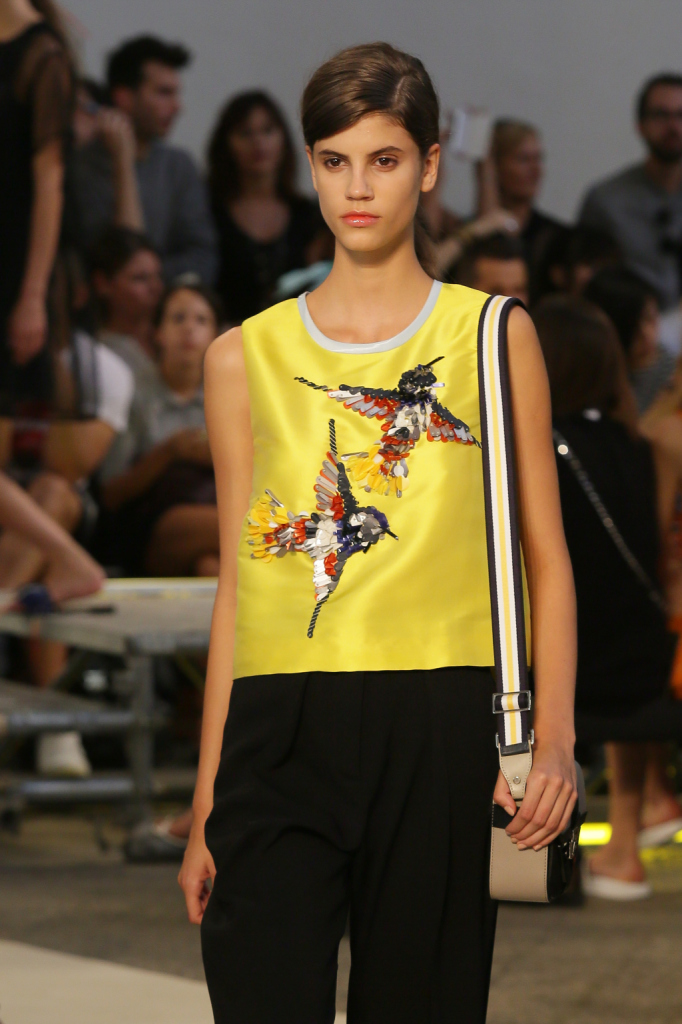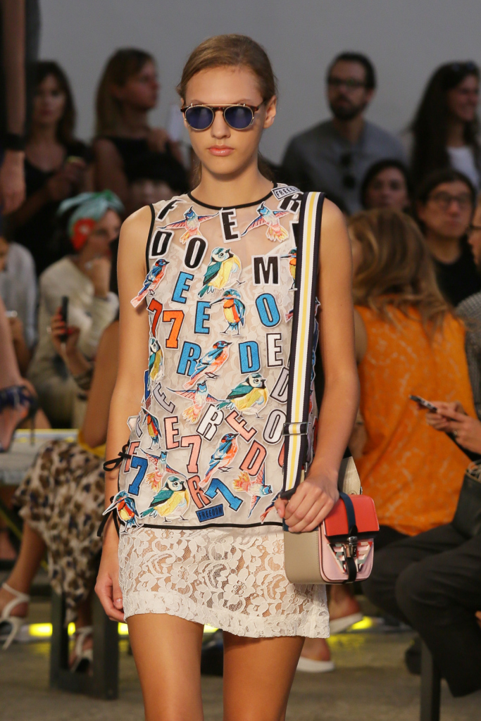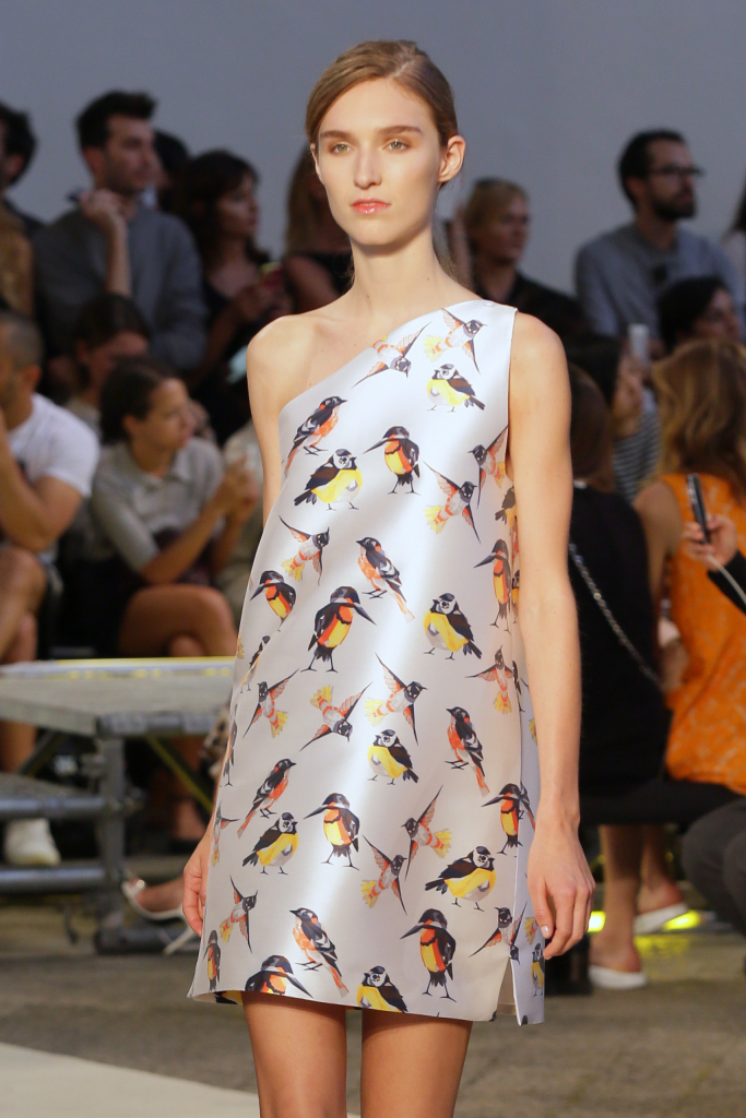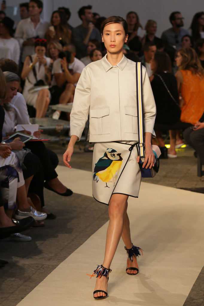 Se i passerotti dettano perfino gran parte della palette della ss 2015 MSGM – nero, bianco, blu, arancio, giallo accanto ai lettering multicolor –, la collezione è un tripudio di pennuti di ogni genere. Lettere capitali e picchi rock style, colibrì & c. che si fanno stampe e pure preziosi ricami per mini abiti e tubini corti e asimmetrici, per gonne e top, per giacche-impermeabili trasparenti. Capi semplici e puliti, dalle linee nette e dal mood assai urban, che le fantasie e gli inserti arricchiscono e addolciscono.