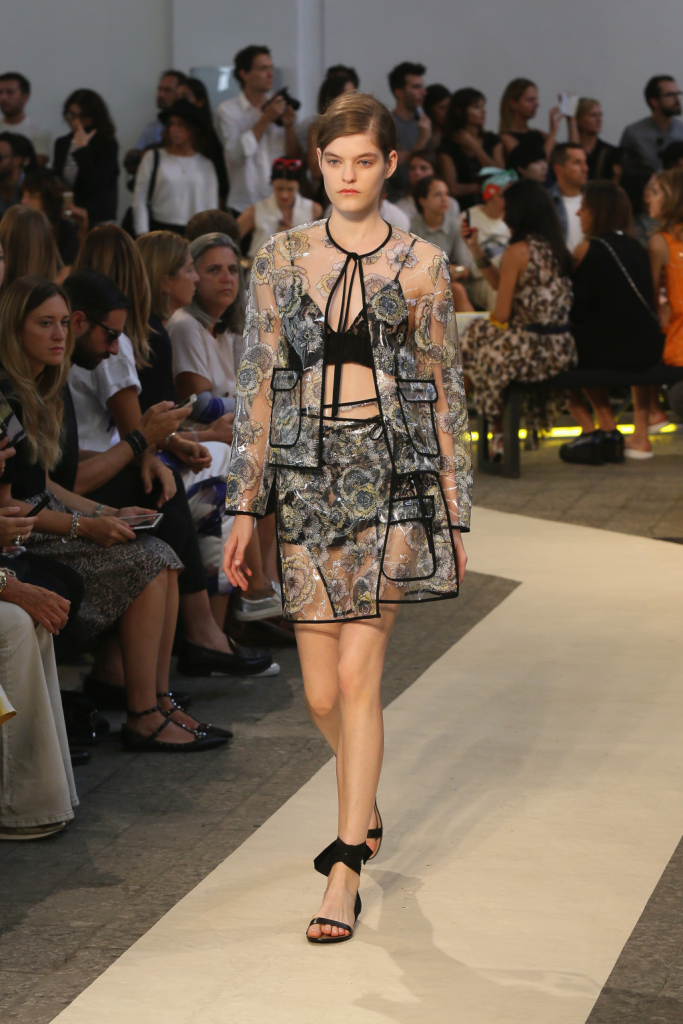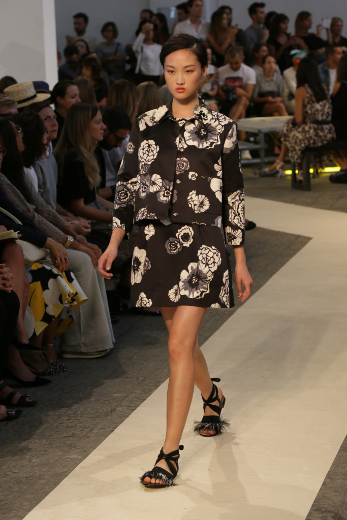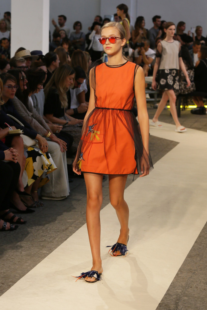 A chiudere la collezione MSGM per la prossima primavera-estate, gonne e vestiti con motivi floreali, arancio e giallo neon abbinati al nero, tubini corti, sottovesti, felpe nere di tulle. Con qualche piuma qua e là, e da abbinare a sandali dal tacco alto o a meno impegnative ciabattine da spiaggia.
