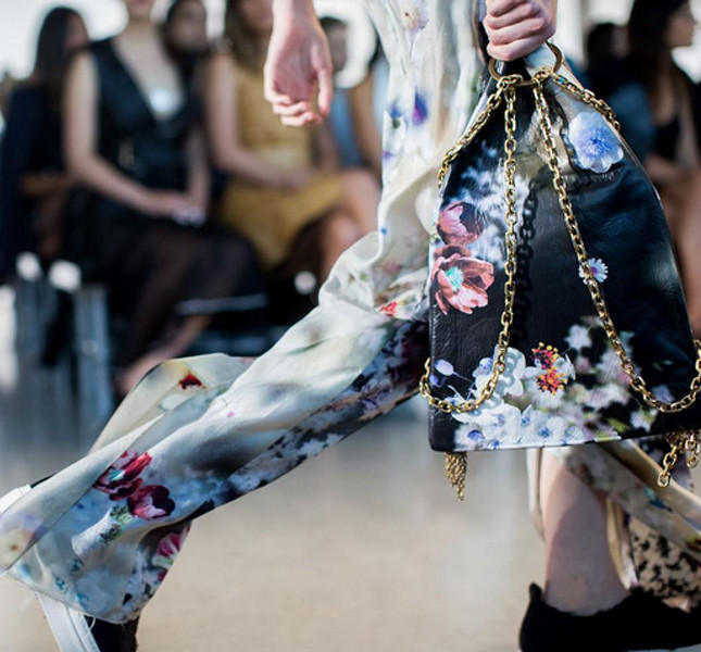 Stampe floreali e pittoriche su abiti, pantaloni e borse a donare un senso di calore agli outfit, texture raffinate, dalla seta al raso, dettagli preziosi, come le catenine in oro, hanno conferito a tutta la sfilata un carattere lussuoso ed etereo.
