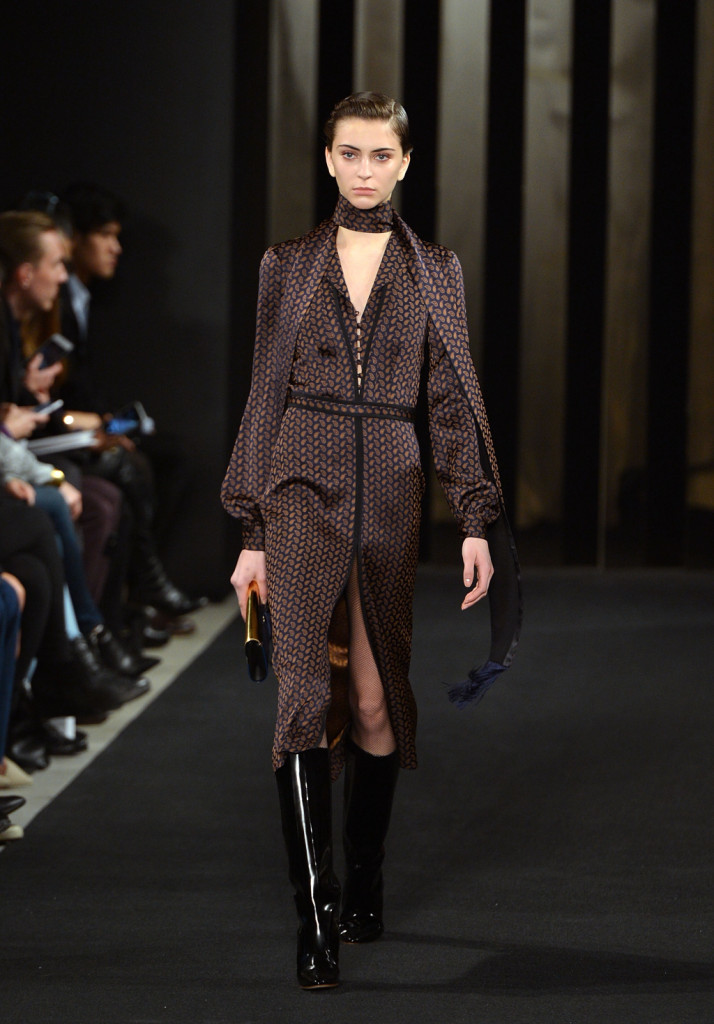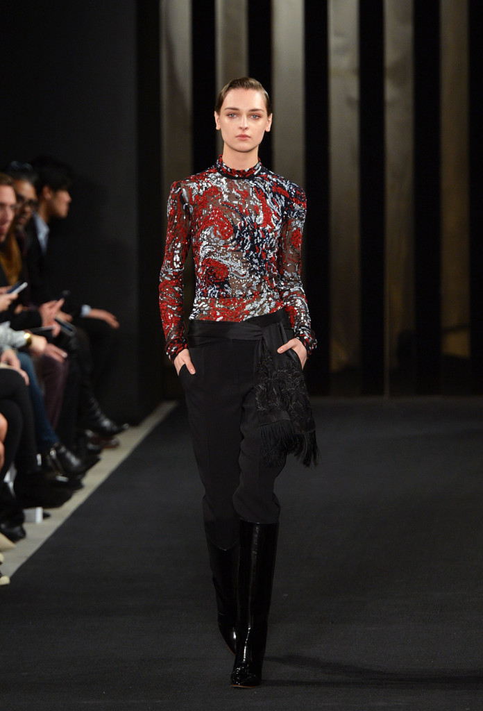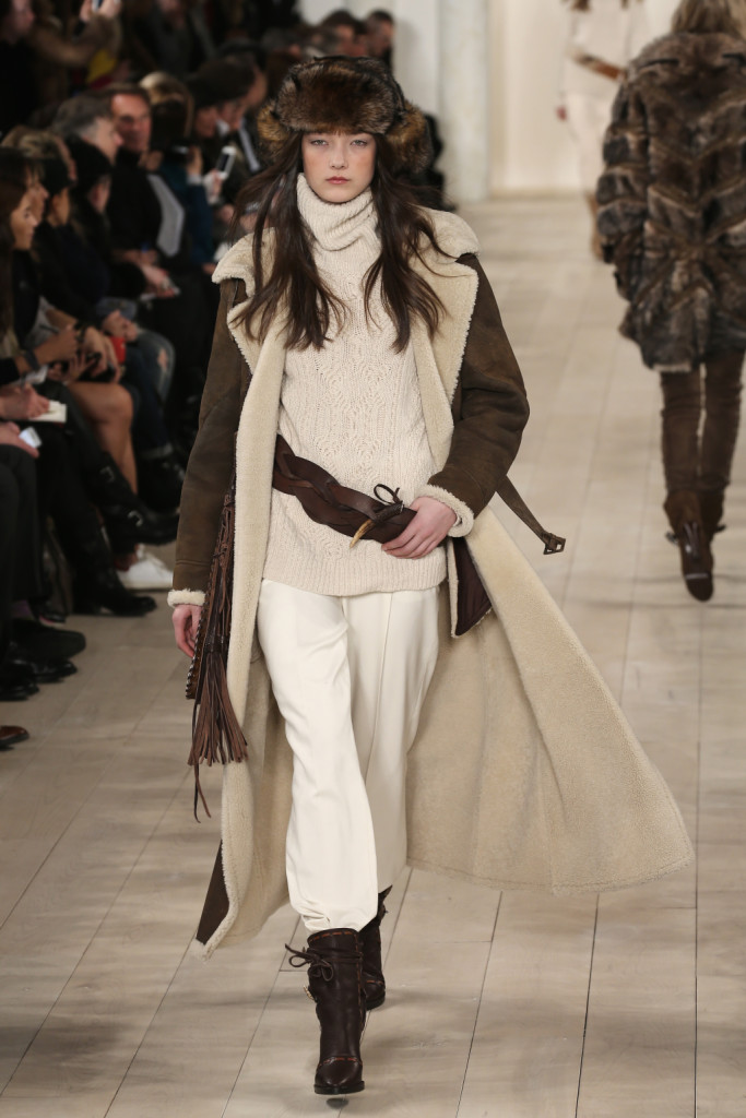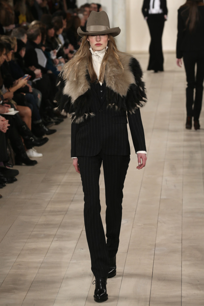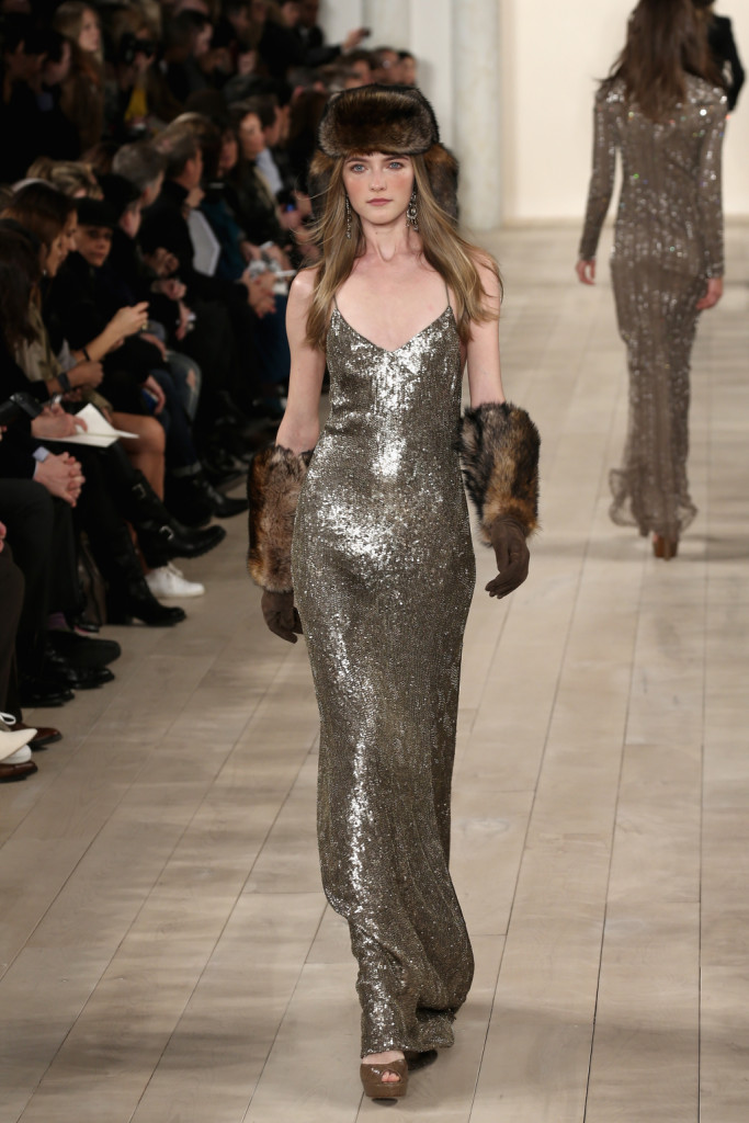 Ad aprire l’ultimo giorno di sfilate della New York Fashion Week FW 2015/2016 è stato Ralph Lauren, che ha mandato in passerella una collezione old America. Lo stilista della Grande Mela ha reso infatti omaggio al passato e alle tradizioni del suo paese con una serie di capi che mescolano influenze wild West a suggestioni mutuate direttamente dagli anni del proibizionismo. Di giorno la sua donna veste shearling avvolgenti, giacche e cappotti dalle linee fluide, patchworked, ricamati, con intarsi di motivi tribali e finiture in pelliccia, maglie e maglioni (davvero tantissimo il knitwear), pantaloni morbidi, gonne sotto al ginocchio che segnano le forme, con colbacchi di pelo e cappelli di panno, interpretando un modello grintoso e volitivo di femminilità. Di sera, invece, si trasforma in una sirena inguainata in abiti di squame di argento o in una garçonne in asciutti tuxedo neri, completi spezzati con bretelle e gonna-pantalone e gessati di taglio maschile.