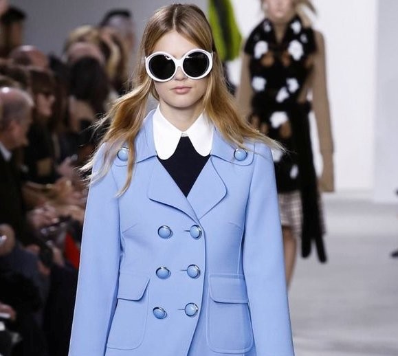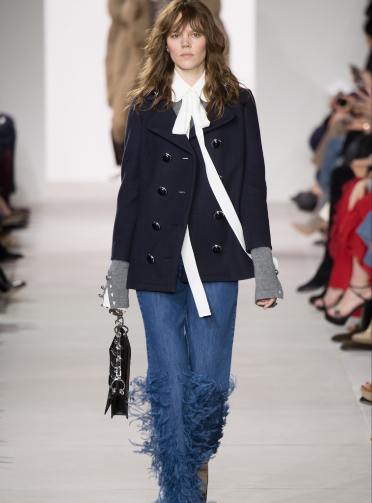 Sulle note di “Wind” dei The Association, apre lo show la modella Freja Beha Erichsen, che sfoggia un classico coat doppiopetto blu navy dal taglio maschile, un’elegante camicia bianca con fiocco al collo e dei jeans decorati con stravaganti piume di struzzo alla caviglia e a completare l’outfit mocassini e una clutch con catenina.