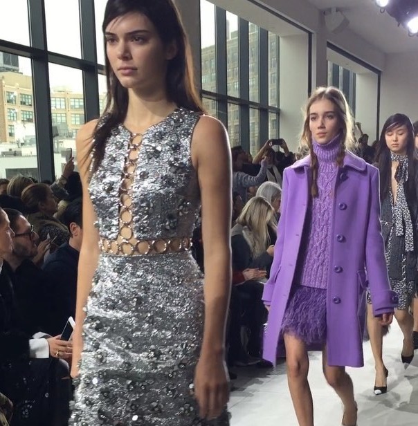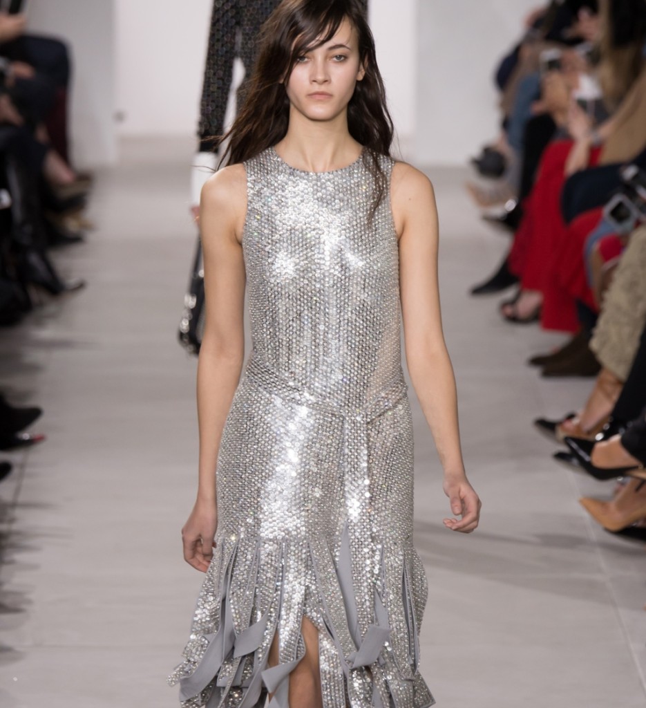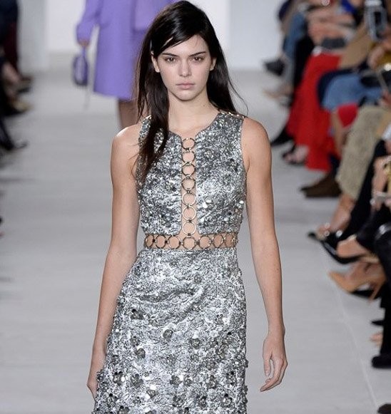 Per Michael Kors ha sfilato anche la fantastica Kendall Jenner che ha sfoggiato un mini dress sui toni dell’argento, caratterizzato da decorazioni floreali in rilievo e anelli metallici su tutta la parte superiore dell’abito.