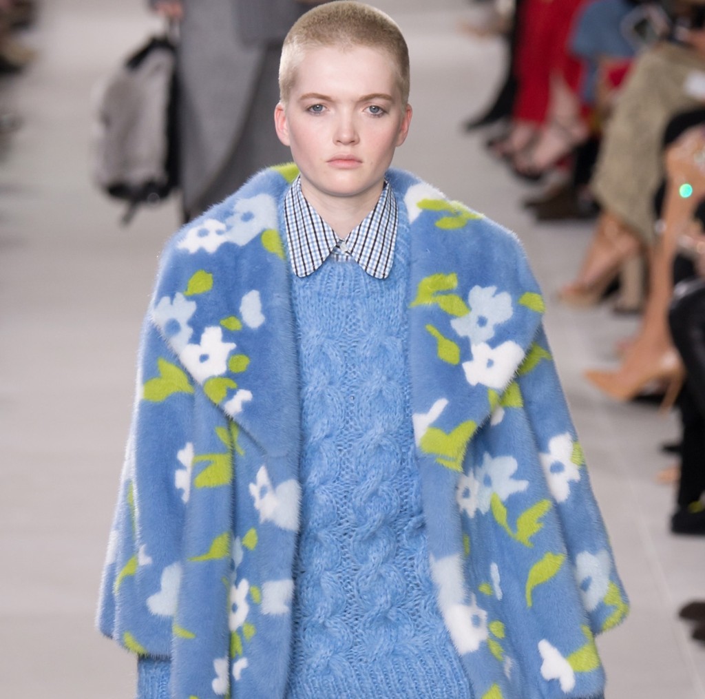 Il mood vintage anni ’60 lo troviamo nelle stupende pellicce over, elemento costante dell’intera collezione, nei maxi occhiali, nei mini dress con maxi colletto, cinturino in vita e motivi a fiori, e ancora nel cropped-pants con motivo tartan che la modella sfoggia insieme a una pelliccia con maxi fiori e un maglioncino sui toni del marrone, dal quale fuoriesce il maxi colletto della camicia in contrasto di colore.