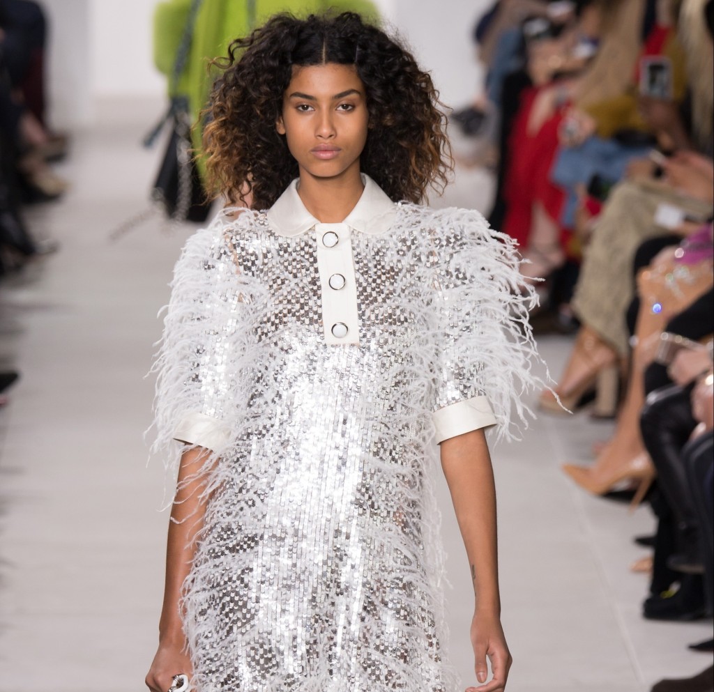 Michael Kors ha presentato anche diverse proposte per la sera come il mini abito stretch con dettagli shining e decorato con piume di struzzo, che la modella sfoggia insieme a décolleté in contrasto di colore e con punta metallica.
