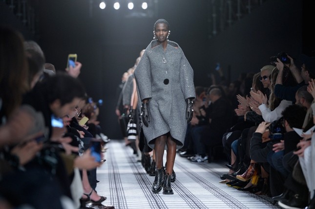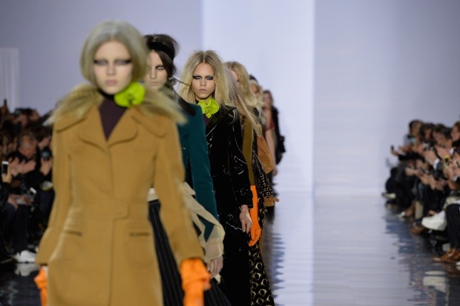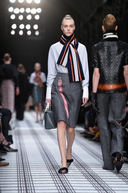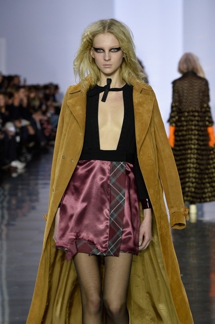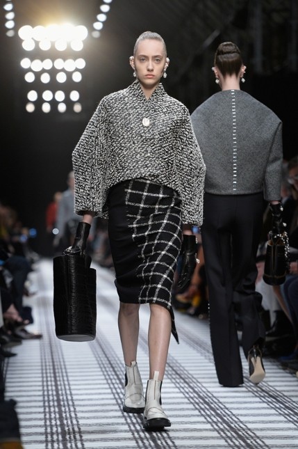 Sul catwalk hanno sfilato giacche dai volumi ampi e con decori geometrici, longuette fascianti, pantaloni stretch abbinati a morbidi maglioni tono su tono, bluse leggere indossate su mini skirt e anfibi, caldi mini dress in maglia, pantaloni a vita alta con cinturino, maxi cinture in pelle sulle gonne a delineare il punto vita, e ancora abiti con volant e trasparenze per una donna sensuale ed elegante.