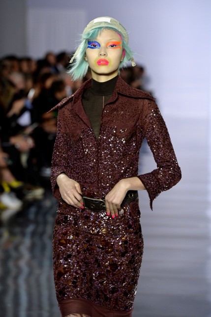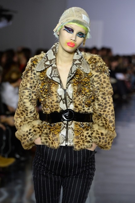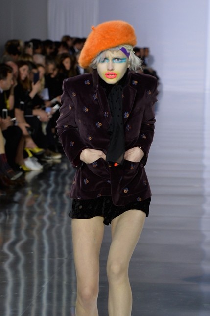 Il make up scelto dalla maison di moda è accentuato, gotico e dark: ombretti neri applicati tutt’intorno all’occhio si alternano a colori più eccentrici come il viola, il verde smeraldo e l’arancione, labbra scure si alternano a lipstick dalle tonalità fluo.