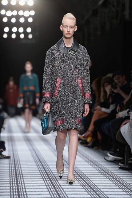 In passerella un susseguirsi di lunghi coat dalle tonalità sgargianti come giallo, viola e blu elettrico, giacche con dettagli fur, gonne ampie e strutturate indossate insieme a morbidi e ampi maglioni, mini dress bon-ton abbinati a berretti e fasce dal mood sporty, trench-coat sfoggiati insieme a trousers dritti e multicolor, pantaloni leggeri e a zampa, e ancora abiti voluminosi, dalle linee scultoree e con decori geometrici.