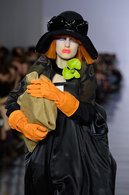 Maxi pochette, cappelli dai colori e dalle forme esuberanti, mary-jane si alternano a eccentriche scarpe fur, spille a fiore verde lime su giacche e abiti.