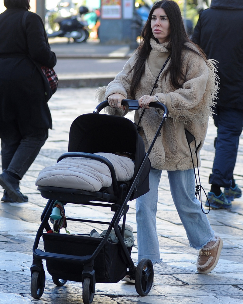 Pomeriggio all’insegna dello shopping per Bianca Atzei, fotografata in centro a Milano insieme alla mamma e al figlio, il piccolo Noa Alexander. Mentre il bimbo, nato nel gennaio del 2023 dall’amore con Stefano Corti, fa un riposino nel passeggino, Bianca fa acquisti nei negozi del quadrilatero della moda. Il suo look casual è tutto da copiare. La giacca shearling beige, dal volume maxi, è abbinata a un paio di jeans morbidi. Ai piedi spiccano le clog con platform di Mou, in vendita a 219 euro. Cuciture spesse e logo in metallo per queste ciabatte dal sicuro impatto visivo.