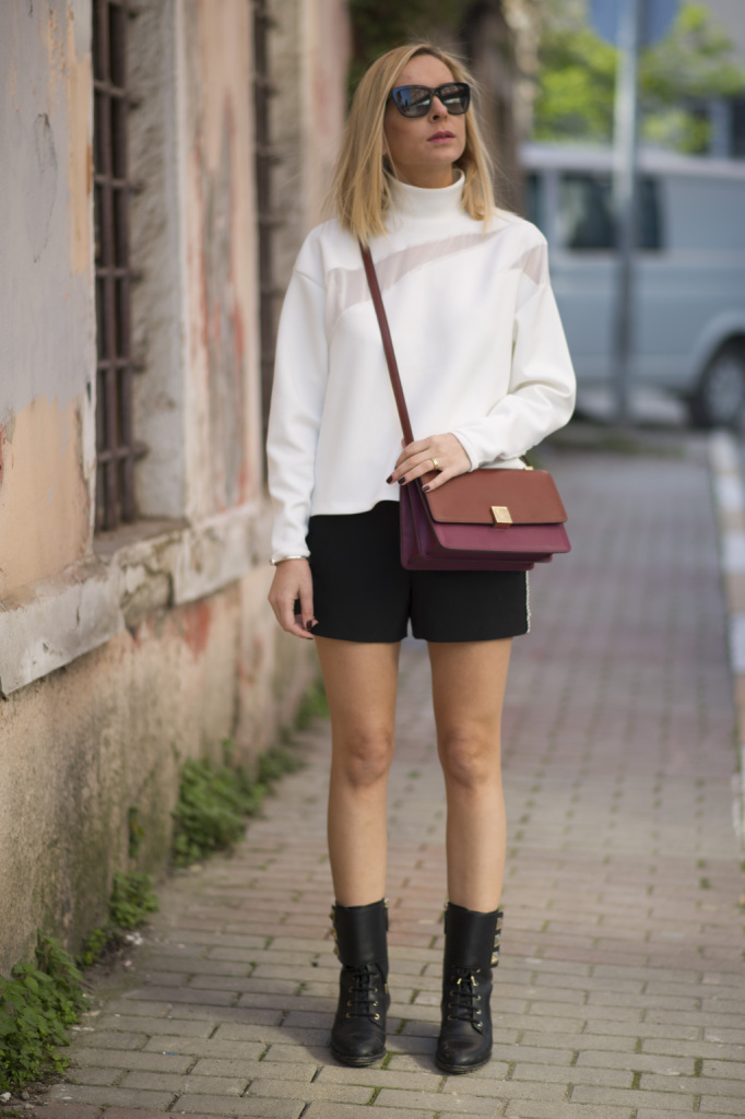 Shorts bordeaux in pendant con borsa, il bordeaux è perfetto se abbinato al nero o al blu notte