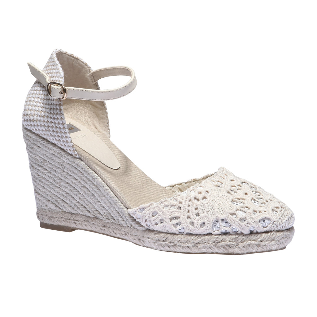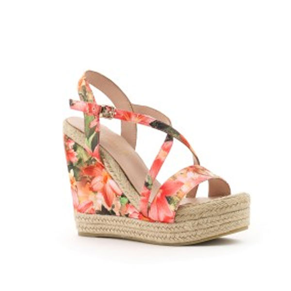 I sandali in tessuto floreale incrociato con cinturino e zeppa vertigo in corda e tessuto di Cafè Noir, quelli con inserto in pizzo di Guess, gli Atrevida con zeppa full color di Desigual, il modello in pelle color salvia di Keys e quello con fascia in pelle e cinturini criss-cross alla caviglia in nabuk, fibbietta in metallo, dettaglio metallizzato e maxi zeppa rivestita in corda di Hogan sono l’ideale per look freschi, unformal, chic e moderni.