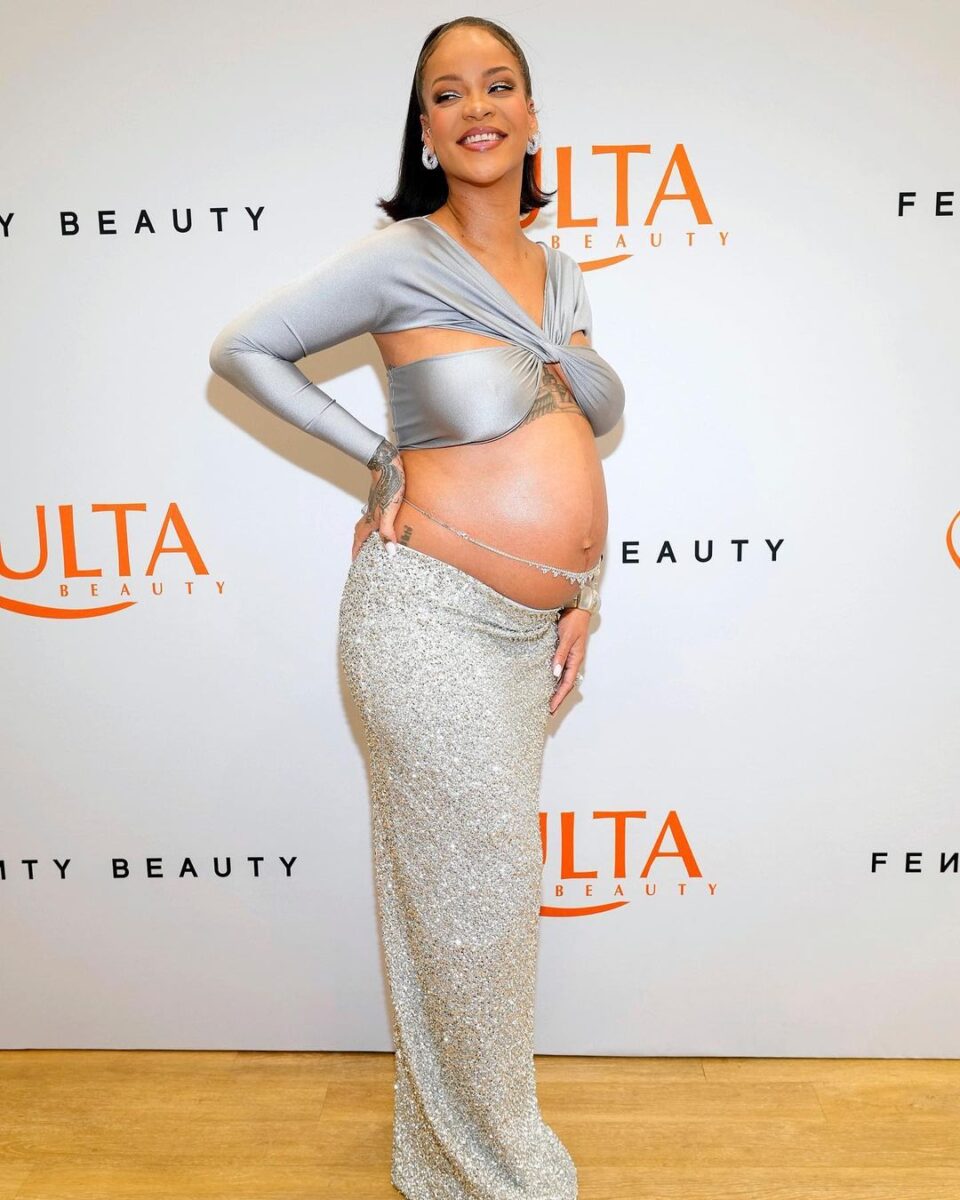“Mamma Ri tutta sorrisi e look”, si legge sulla pagina Instagram di Fenty Beauty, dove si possono ammirare gli scatti di Rihanna con un outfit argento brillante e rivelatore: un completo di Coperni composto da gonna in lurex e top a maniche lunghe maliziosamente annodato sul seno.