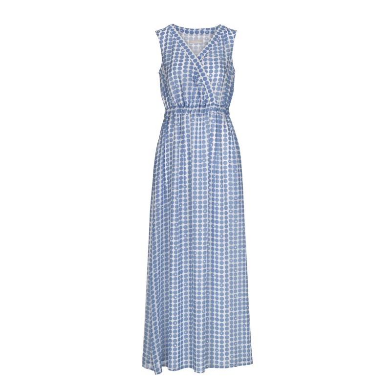 Abito lungo senza maniche realizzato in georgette con corpetto incrociato. Stampa a pois. Elastico in vita. Capo foderato. 199 euro